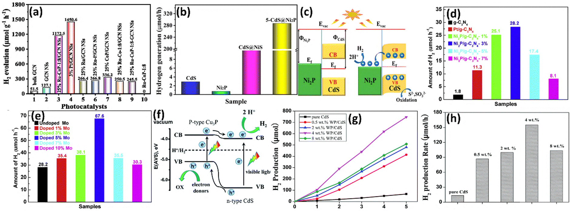 | Fig. 8 (a) Comparison of the typical rate of hydrogen evolution for the photocatalysts over 5 hours. Reproduced with permission.77 Copyright 2021, Elsevier. (b) The rate at which various catalysts produce hydrogen by photocatalysis. (c) Diagrammatic representation of CdS@Ni2P charge transport. Reproduced with permission.78 Copyright 2022, American Chemical Society. (d) H2 evolution rates over samples of Ni2P/g-C3N4 with varying Ni2P contents. (e) H2 evolution rates over the Ni2P/g-C3N4–3% sample with varing Mo doping. Reproduced with permission.80 Copyright 2020, Elsevier. (f) A potential reaction pathway for the Cu3P/CdS heterojunction-based photocatalytic evolution of H2. Reproduced with permission.82 Copyright 2015, Royal Society of Chemistry. (g) and (h) The rate of production of hydrogen (g) with time and (h) over WP/CdS photocatalysts at different WP loading concentrations (0.5 wt%, 2.0 wt%, 4.0 wt%, and 8.0 wt%). Reproduced with permission.84 Copyright 2017, Royal Society of Chemistry. | ||