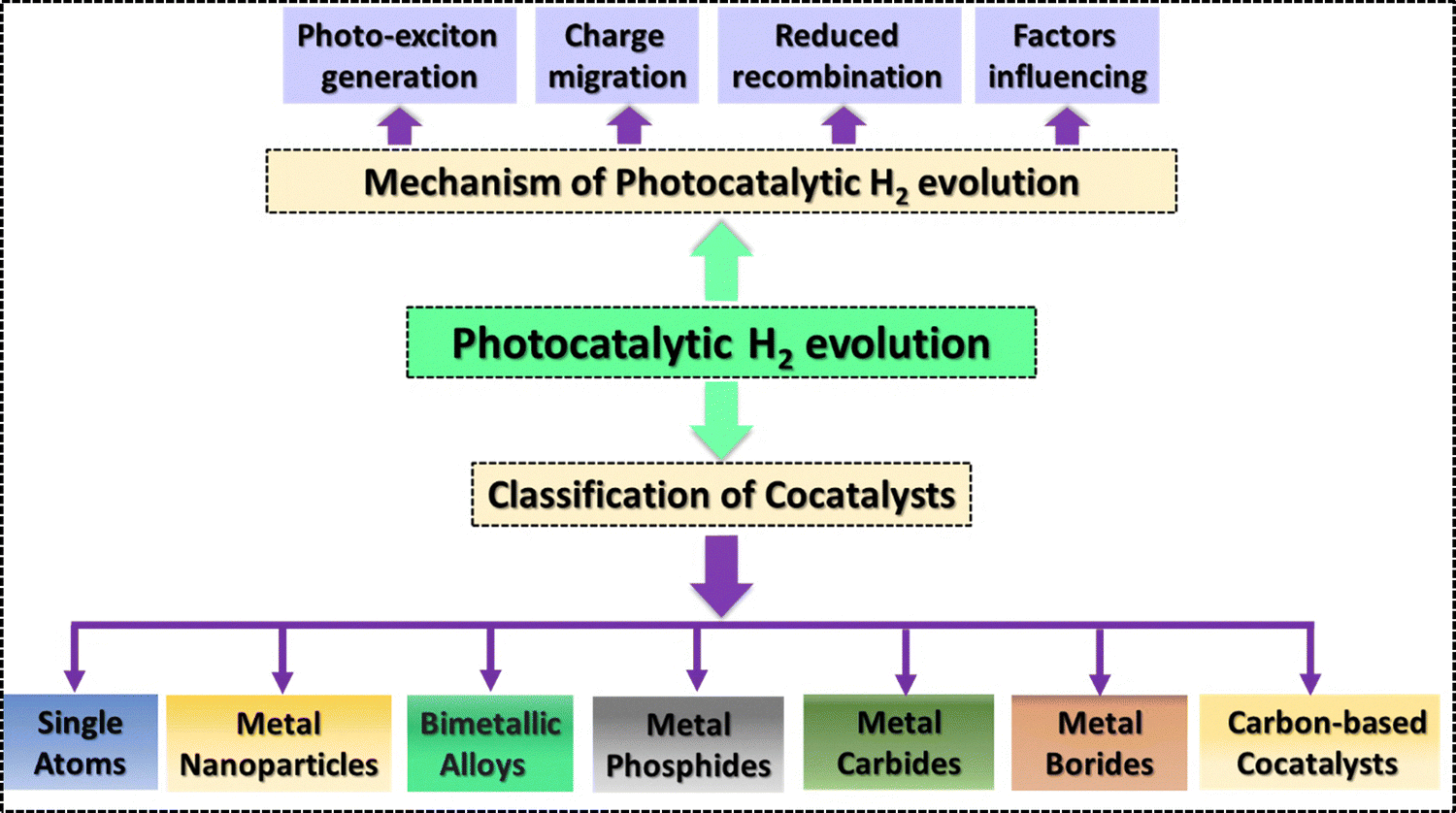 With the recent surge in advancements related to the development of cost-effective, stable, and efficient cocatalysts, it is an opportune moment to systematically evaluate and summarize photocatalytic systems where semiconductors are integrated with cocatalysts. Some impressive reports have summarized the synthesis of cocatalysts with their loading process over the support semiconductor, along with their photocatalytic applications in various fields like carbon dioxide reduction, nitrogen fixation, and pollutant degradation. Similarly, different cocatalyst loading over a particular support material has been summarized recently. Moreover, reviews summarizing the localized surface plasmon effect based cocatalysts have also been reported. However, a comprehensive assessment concerning the critical role of various cocatalysts over well-known support materials in photocatalytic H2 evolution is scanty. In this article, the contribution of cocatalysts in enhancing the photocatalytic H2 evolution from water splitting is discussed in detail. Furthermore, the cocatalysts have been classified as metal nanoparticles, single atoms, bimetallic alloys, metal oxides, transition metal dichalcogenides, metal phosphides, metal carbides, metal borides and carbon based cocatalysts and their modification with various widely used semiconductors is categorically discussed. Advantages as well as disadvantages of the cocatalysts have been discussed briefly. Finally, an assessment of the present state and future prospects of the field is given to stimulate creative ideas for developing cocatalyst-modified heterojunction systems in catalytic applications within this rapidly expanding area. This study thus concentrates on new developments in the use of cocatalysts in photocatalytic H2 evolution reactions. The various cocatalysts utilized for photocatalytic H2 evolution and covered in this article are shown in Scheme 1.