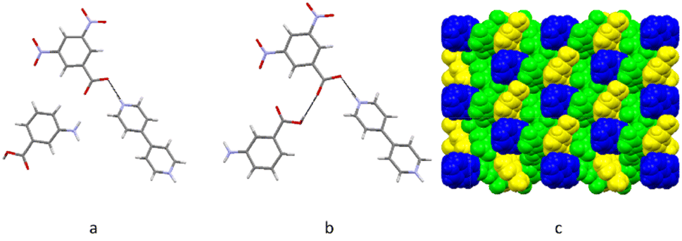 bpy2+, i.e. it is a co-crystal salt. This ternary multi-component crystal, which is also orange, was obtained by sublimation using the same conditions described for systems A and B above. It should be noted that there was some degree of decomposition of the starting material, which remained at the bottom of the tube as a black amorphous material. The same orange crystals could also be obtained at 170 °C, with a smaller degree of decomposition of the starting material. The asymmetric unit of C contains one molecular ion of dnba, one molecule of 3aba and half of the molecular ion of bpy (Fig. 2). The 3aba molecule is disordered, and has been modelled in two different positions, which have been shown separately in Fig. 2a and b. Proton transfer between dnba and bpy has occurred, which forms a charge-assisted hydrogen bond between the two molecular ions. A hydrogen bond forms between the carboxylate of dnba and the carboxylic group of 3aba (O7–H7⋯O1). The packing consists of alternating stacks of each of the different molecules and ions of this co-crystal (Fig. 2c).