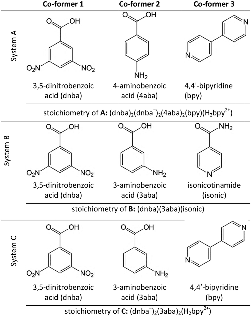 1 molar ratio of co-formers gave the same binary multi-component crystals as those reported in the CSD for a particular conformer combination (Table S4). For the combination of dnba + isonic, previous work has reported that the solvent system determines whether the 1