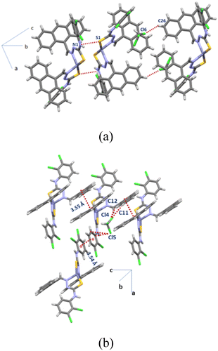 | | Fig. 6 The packing diagrams of (a) [Zn{23-ClATU)}2·CHCl3]-1 showing the intermolecular S–π interactions and (b) [Zn{23-ClATU)}2·CHCl3]-2. | |