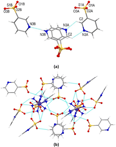 1 stoichiometry (Fig. 1a). The cation is located at the intersection of three twofold axes. The asymmetric part of the unit cell comprises one quarter of the cation, three quarters of the pys− anion, and one quarter of the neutral Hpys molecule (Fig. S9a†). In the model of structure, the pys− anion and the neutral Hpys molecules in the asymmetric part of the unit cell are located at approximately the same place, overlap almost completely, and differ mainly in the position of the nitrogen atom, N3A and N3B. In each of these two close positions A and B, the organic components have been refined with a site occupancy factor of 0.5. In position A (N3A), the neighboring twofold related pys− anions are linked by a couple of C(2)−H⋯N(3A) bonds with a distance of 2.941(8) Å. In position B (N3B), the neighboring twofold related components form an N(3B)−H⋯N(3B) = 2.879(8) Å bond, as illustrated in Fig. 1a. Only one N3B in such a dimer is protonated. However, since these components are symmetry related and indistinguishable from a structural point of view, the H atom should be statistically distributed between these two equivalent nitrogen atoms, providing a charge balance in the structure because one of the components is charged and another one is neutral. The disordered model with ‘half’ H atoms has been used in refinement.