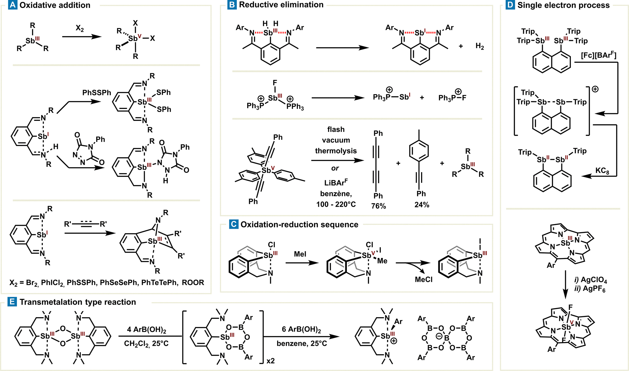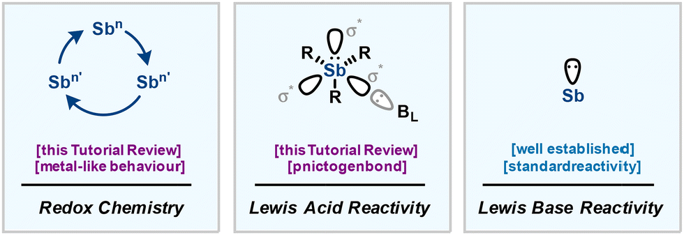 • Antimony is located in the middle range of the pnictogen family; therefore, one can expect relatively mild conditions for Sb reduction (compared to P and As which require strong reducing agents) and oxidation (compared to bismuth which requires highly oxidizing agents). Additionally, low valent antimony (SbI) exhibits strong nucleophilicity, a consequence of its p-orbital lone pair being highly prone to oxidation (Fig. 7 and 8(A)).