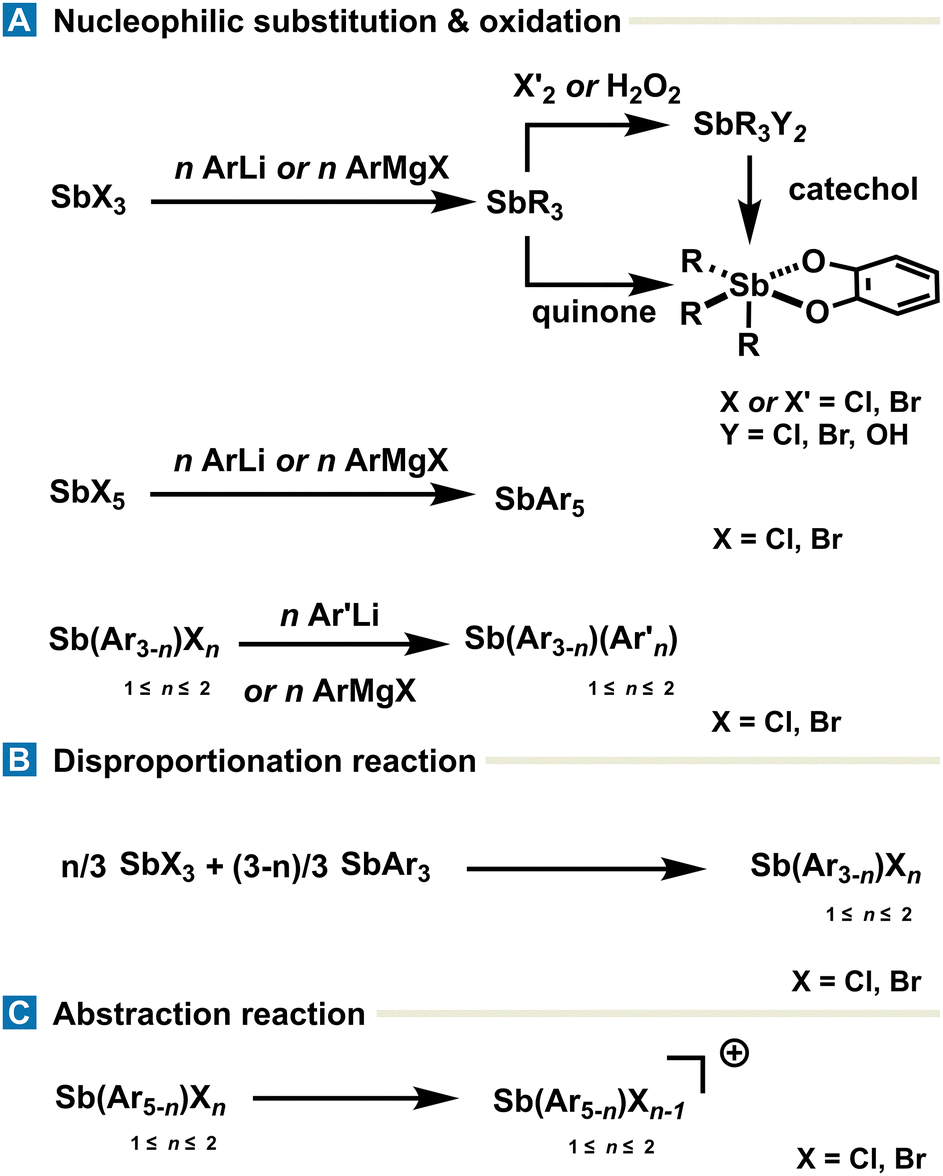 | Fig. 2 Overview of a few key syntheses of common organoantimony derivatives obtained by (A) nucleophilic substitution or oxidation, (B) disproportionation or (C) abstraction reaction. | ||