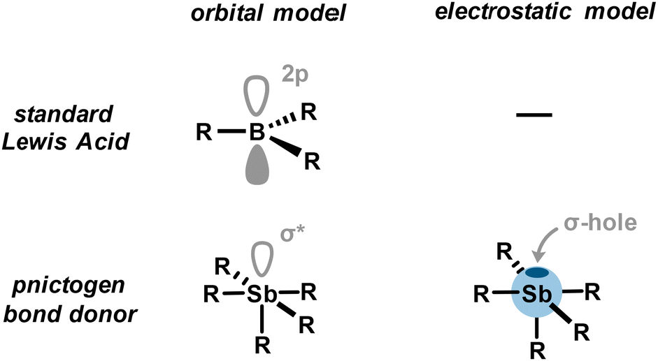 Consequently, pnictogen bond donors may be regarded as a particular class of Lewis acids. Like conventional Lewis acids, they are capable of accepting an electron pair; however, the accepting orbital is an antibonding σ* molecular orbital rather than a nonbonding atomic orbital. This distinction implies that the balance of interactions differs, combining a well-defined electrostatic potential (the σ-hole) with a characteristic orbital framework that sets them apart from classical Lewis acids. These differences give rise to unique features such as weaker and reversible PnB which are, however, generally more robust compared to other non-covalent interactions (e.g., hydrogen bond, π-stacking, and dispersion forces). Thus, for the sake of clarity and due to close similarities, PnB can be considered as the non-covalent counterpart of a classical Lewis acid. By extension to the latter and keeping in mind these differences but also similarities, it is therefore frequent to refer to the Lewis acidity of a pnictogen bond donor.