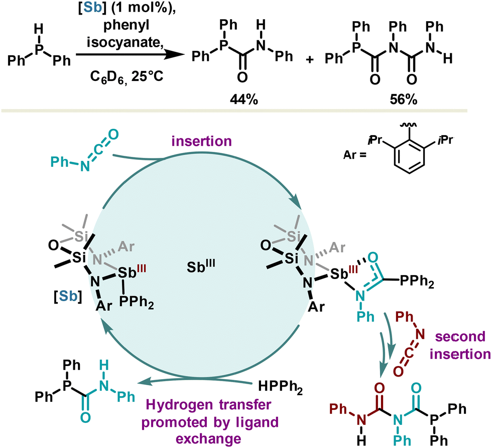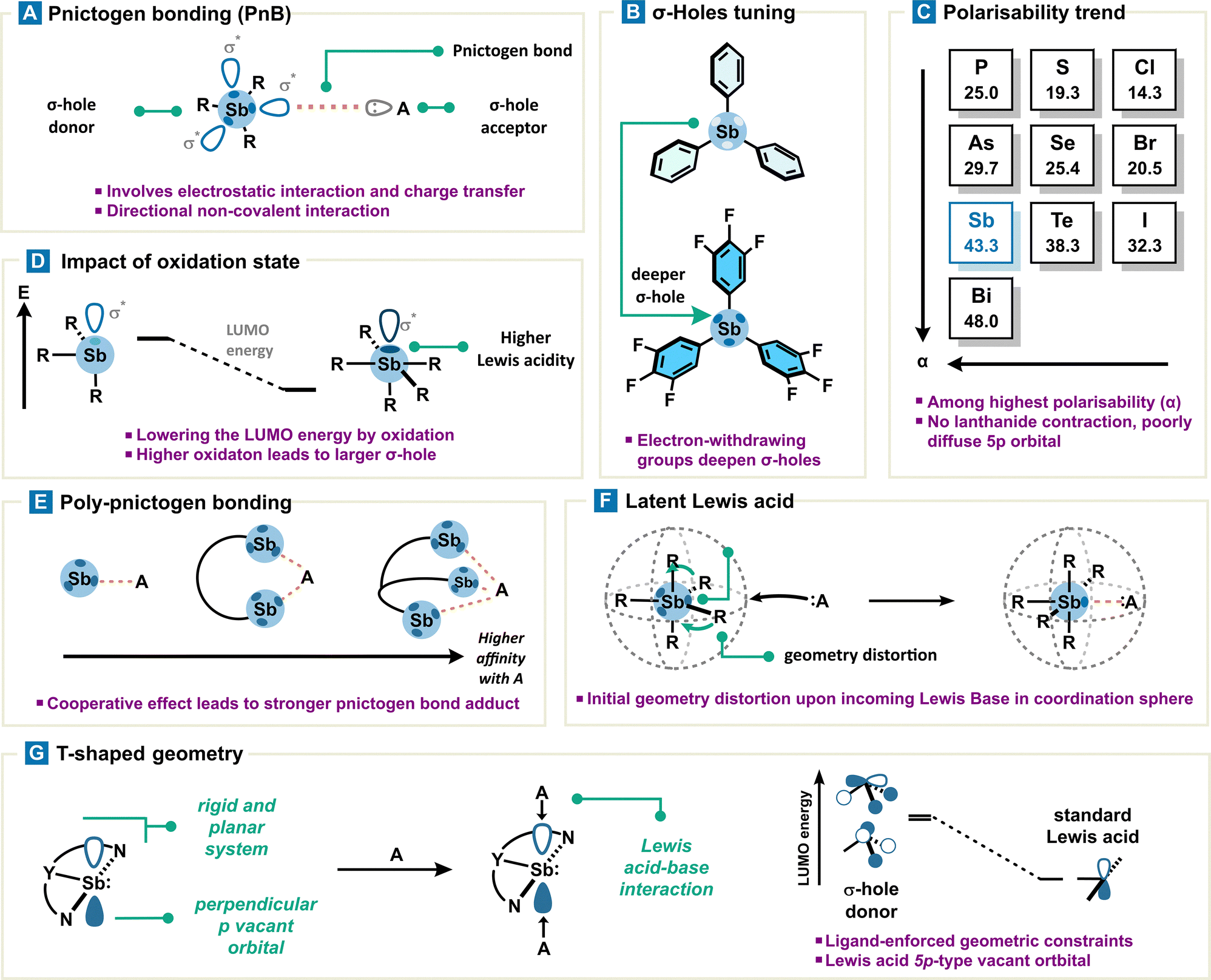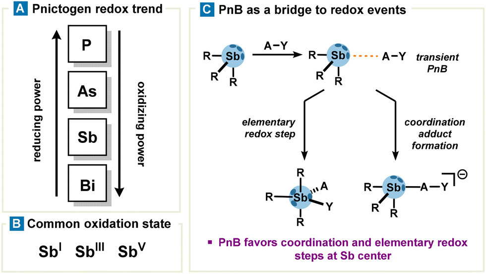 • Pre-association via PnB can orient and polarize substrates with the Sb center, effectively lowering the activation barrier for a simple coordination step as well as for elementary redox steps (Fig. 7(C)).