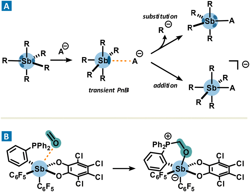In contrast, organoantimony derivatives also act as strong acid sites, which, in the presence of Lewis bases, could lead to the formation of covalent bonds. Interestingly, their formation involves a σ-hole. The transition state leading to their formation of these robust adducts involves a pnictogen bond which is fleetingly formed before evolving into a covalent bond. As a consequence, the formation of the new covalent bond leads to the subsequent cleavage of another Sb–R bond or the formation of an ate complex (Fig. 5(A)). Such a non-isolable pnictogen bond is called a transient PnB. A typical example of a transient pnictogen bond driving the formation of an ate complex is the binding of fluoride or chloride for sensing or anion transport applications.41 Another relevant example of transient PnB is the complexation of formaldehyde with phosphino-stiborane (Fig. 5(B)),42 which may suggest new potential applications due to a reactivity reminiscent of frustrated Lewis pairs. While the formation of a covalent bond may involve transient PnB, this aspect will not be addressed in the next discussion which highlights instead non-covalent catalytic processes driven by PnB.