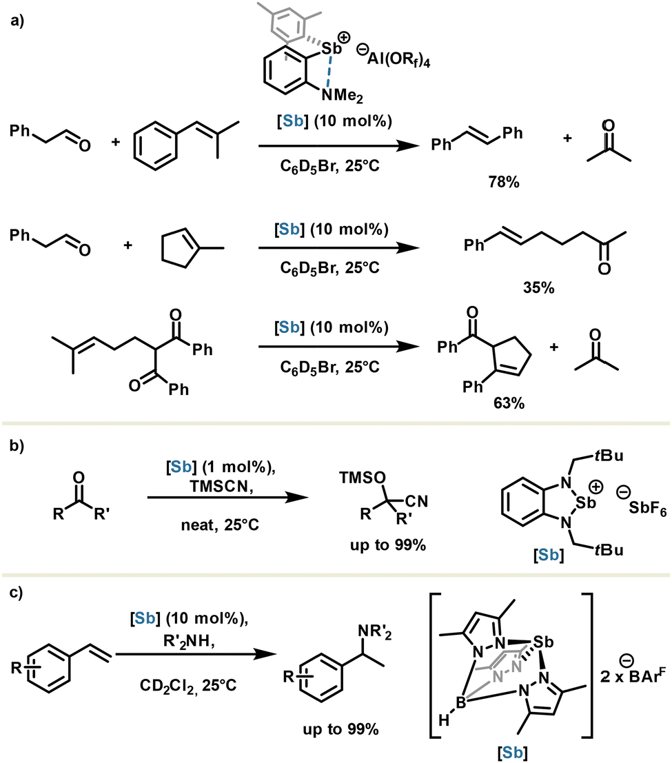 | Scheme 10 (a) Carbonyl olefin metathesis, (b) cyanosilylation and (c) hydroamination reactions catalyzed by cationic antimony derivatives. | ||