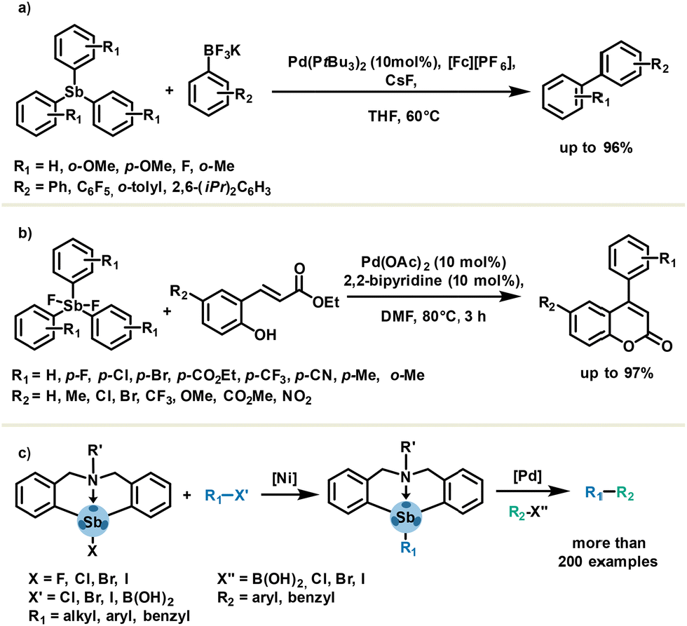 Another class of organoantimony such as azastibocines features an intramolecular PnB Sb⋯N, which is responsible for enhanced reactivity in cross-coupling reactions. Taking advantage of this feature, the Qiu group investigated and developed several nickel- and palladium-based cross-coupling methodologies (Scheme 11(c)). This impressive work enabled fully operational synthetic routes for the coupling of a wide range of building blocks in a two-step reaction protocol.74–76