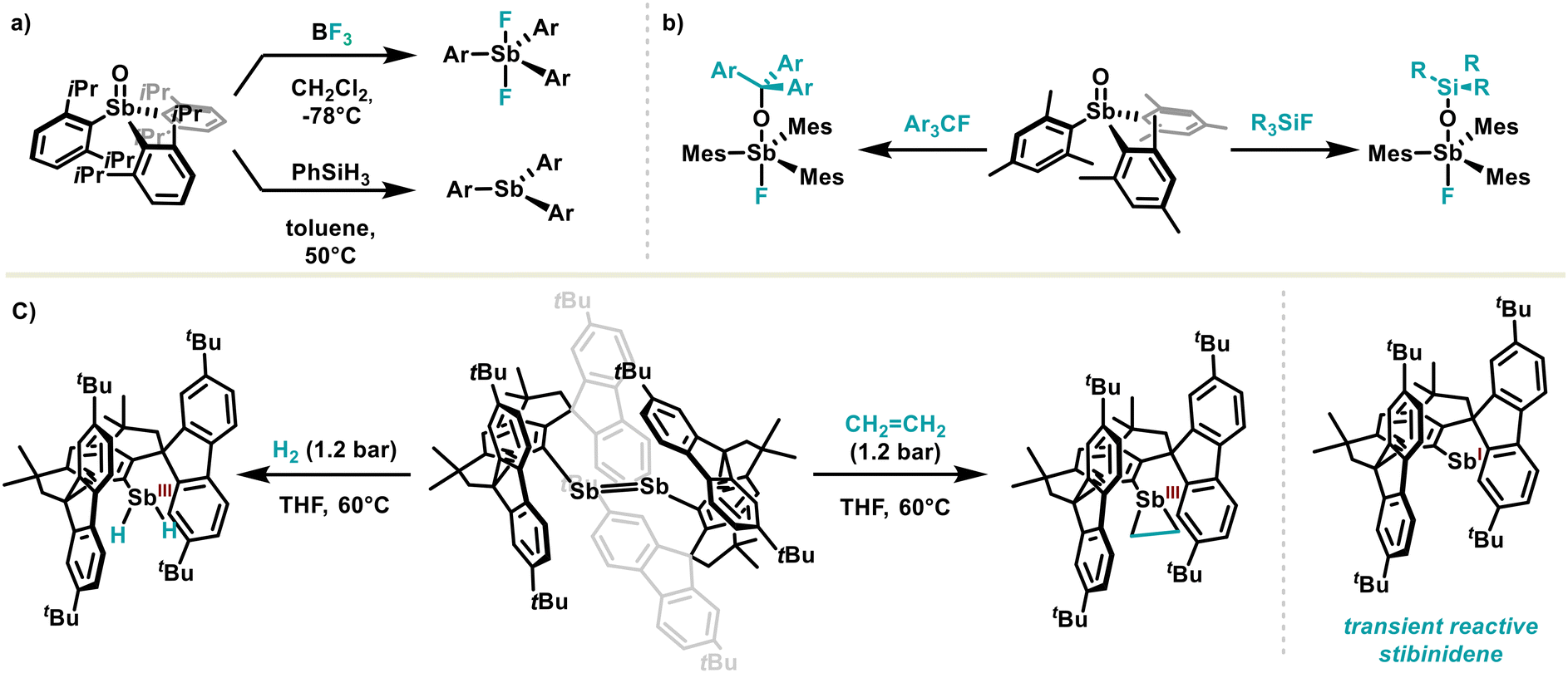 Taking small molecule activation one step further, the Cornella group superbly achieved in 2023 hydrogen and ethylene activation with sterically distorted distibenes, under very mild conditions (Scheme 12(c)).93 By using bulky hydrindacene ligands, the authors obtained distibenes featuring unusual long Sb