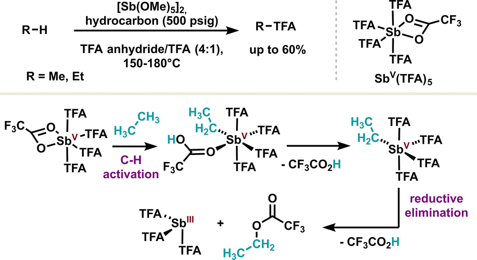 Other elementary redox steps in antimony redox chemistry have also been unlocked, such as C–H activation, which is, par excellence, the hallmark of transition metals. The Periana group was the first to use stiboranes(V) in the C–H activation of small molecules such as methane or ethane. The antimony complex was shown to activate small molecules through the formation of a polarized C–Sb bond, leading to a pentavalent complex after ligand decoordination (Scheme 13). The high oxidation state of the latter favors the reductive elimination, releasing both the stibine(III) and the C–H activated product.95 The authors also demonstrated quantitative C–H activation with high selectivity by replacing trifluoroacetic acid with sulfuric acid and using a pentamethoxy antimony(V) derivative; noteworthily, a C–H activation mechanism in a similar fashion was confirmed.96 This proof of concept of C–H activation of light alkanes adds another metal-like feature to the antimony toolbox. Moreover, the pentavalent antimony scaffold employed in this study is relatively simple, offering considerable opportunities for system improvement through the introduction of more complex ligands. It is also worth noting that other C–H activation reactions have been reported on larger molecules, such as the phenolate anion, using dichlorostibine(III).97