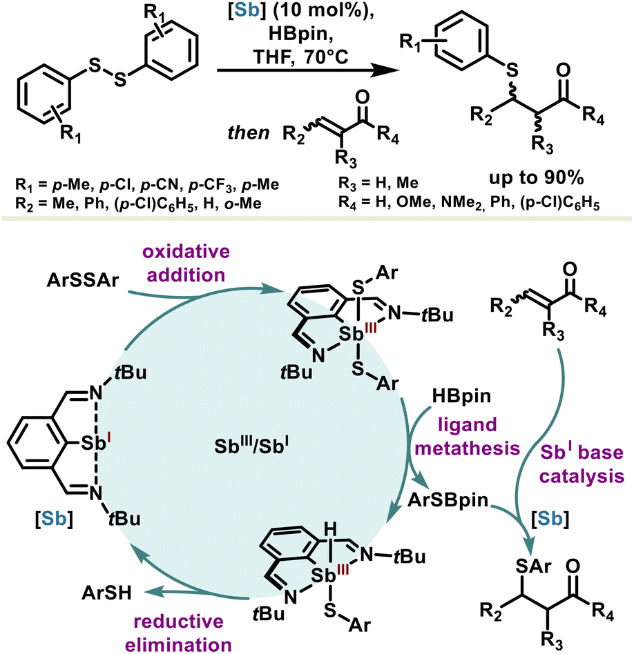 Capitalizing on the ambiphilic properties of stibinidene(I), the Zhou group used these features for Sb(III)/Sb(I) redox catalysis with 10 mol% loading for hydroboration of disulfides. The propensity of stibinidene(I) to undergo oxidative addition was used to initiate the catalytic cycle with diaryldisulfides ArSSAr. The resulting stibine(III) performs a hydrogen transfer with pinacolborane (HBpin), leading to a sulfidoborate ArSBpin and a fleeting hydridostibine(III) intermediate which regenerates spontaneously into the catalyst through a reductive elimination (Scheme 14).98 The basic character of the stibinidene(I) catalyst was subsequently put to contribution for in situ valorization of the so-obtained sulfidoborate and thiophenol products into β-sulfido carbonyl compounds through a Michael reaction. The one-pot access to β-sulfido carbonyl compounds through low-valent antimony redox catalysis, coupled synergistically with antimony Lewis base catalysis, is unprecedented and is expected to pave the way for using the many facets of antimony in catalysis. Moreover, similar antimony reactivity with respect to organobismuth should legitimate further investigations in this area.