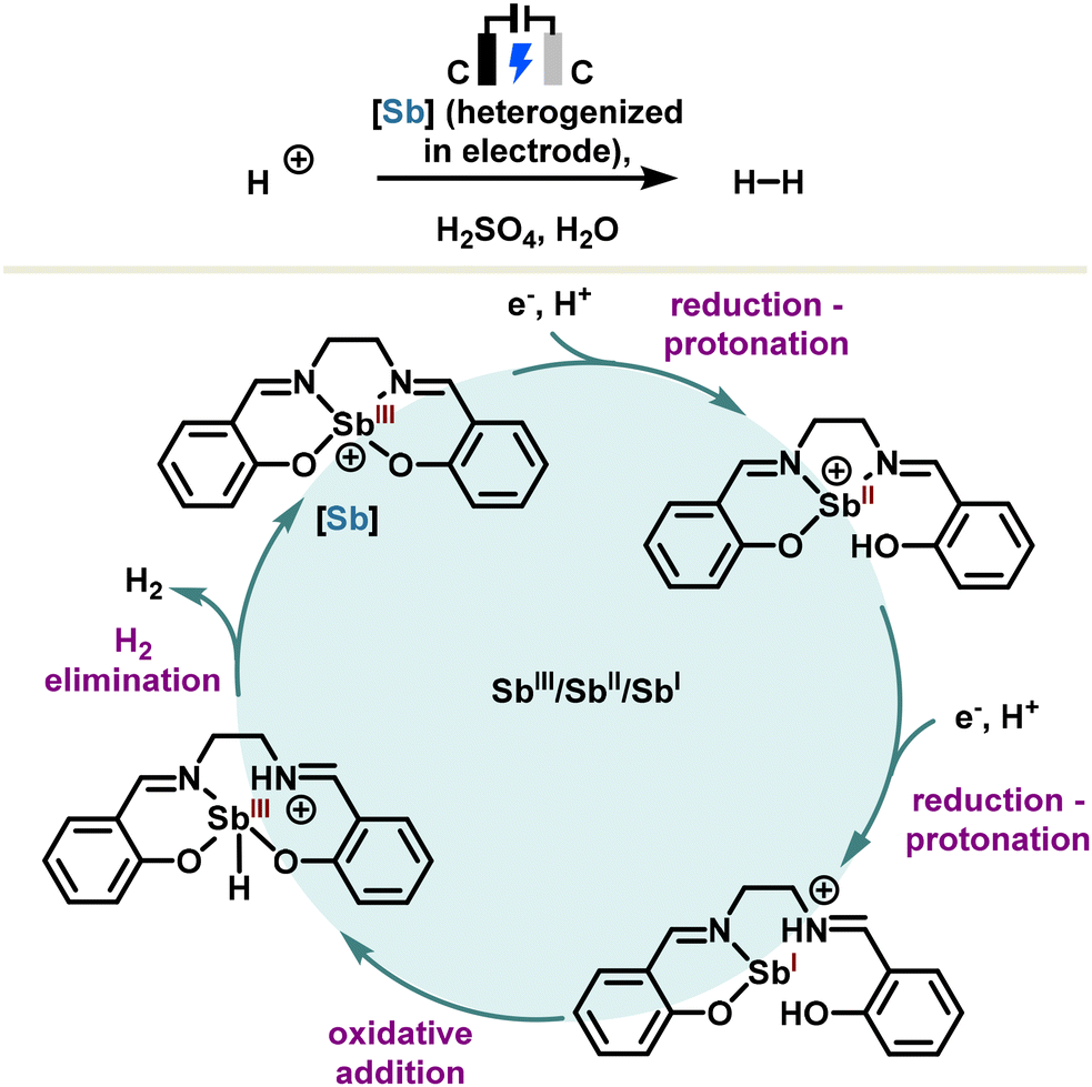 Alternatively, the catalyst can also be supported directly in an electrode as reported by the Jiang and Vogiatzis group which developed an antimony(III) salen heterogenized in a glassy carbon electrode.100 The reaction proceeds via an antimony-assisted and ligand-centered pathway involving sequential two-electron reduction and protonation steps to produce H2 electrocatalytically. A simplified redox catalytic cycle is depicted in Scheme 15, in which the antimony(III) salen results in a stibinidene(I) after two sequential electron reduction–protonation steps. The latter undergoes a formal oxidative addition leading to a hydridostibine(III) which, after hydrogen elimination, regenerates the stibine catalyst. Put in perspective, these results provide an in-depth analysis of the underlying redox mechanism, opening new avenues in heterogeneous redox antimony electrocatalysis.