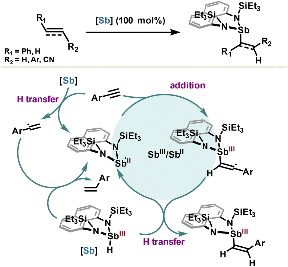 Hydrometalation of alkenes and alkynes is a key elementary reaction that offers a direct route to alkyl- or alkenyl-metal intermediates which are highly valuable in organic synthesis applications. To this extent, the Chitinis group reported uncatalyzed hydrostibination reactions of alkene and alkyne bonds, as a new class of elementary hydrometallation reactions requiring neither a radical initiator nor additives such as metals or Lewis acids (Scheme 16).101 With the intention to design a highly reactive hydrostibination reagent whose LUMO is sufficiently low to engage with unsaturated substrates, the authors prepared a hydridostibine(III) with a rigid naphthalenediamine scaffold. Increase of the Sb–N bond polarity with diamine ligands enables LUMO localization on the Sb center and enhances its Lewis acidity (with respect to Sb–C bonds); these features are required conditions for hydrometallation and somehow reminiscent of borane by analogy. Most importantly, the planar nature of the naphthalenediamine ligand, flanked by a bulky triethylsilyl group, imposes a distorted geometry around the antimony center, which maintains its acidity by preventing any back donation of nitrogen lone pair. In addition, the silyl groups ensure stability of the reagent against H2 elimination and promote higher reactivity of the Sb–H bond via a geometry-permitted β-silicon effect (σN–Si → σSb–H). The meticulously designed reagent performed hydrostibination reactions in excellent yields with alkynes and alkenes but also with azobenzene and activated aldehydes. Strikingly, the hydrostibination reaction from terminal arylacetylenes yields selectively to anti-Markovnikov Z-olefins, which is in contradiction with anti-Markovnikov E-olefins usually observed via syn-addition in the hydroboration reaction. The unpredicted selectivity emerges from a homolytic mechanism initiated by the generation of a stibinyl(II) radical, resulting originally from hydrogen transfer between hydridostibine(III) and arylacetylenes (Scheme 16). The stibinyl(II) radical participates then in a cycle featuring two oxidation states Sb(II) and Sb(III), leading after a final hydrogen transfer to the hydrostibination product.102 The so-obtained Z-olefins are rather difficult to obtain and usually require metal complexes with tailored ligands, which renders hydrostibination stereoselectivity both unorthodox and of great interest for synthetic methodology.