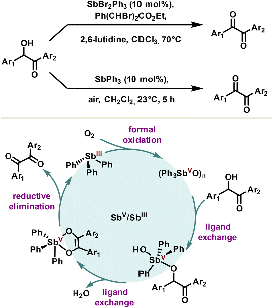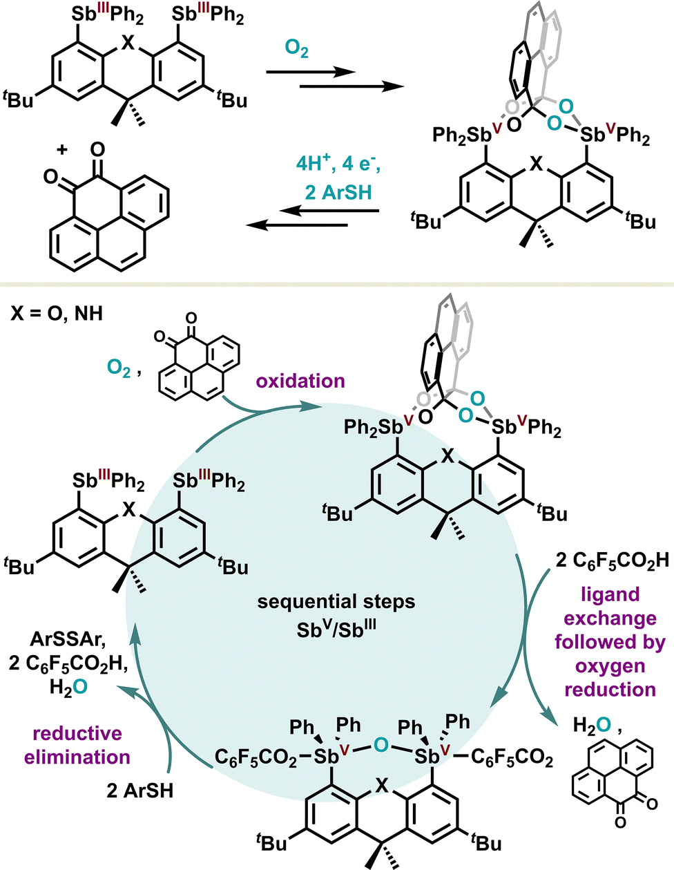In the same way as non-noble transition metals, the redox properties of antimony derivatives prompt them to be oxidized under aerobic conditions, which makes them a potent platform for the two-electron reduction of O2. Inspired by these features, the Gabbaï group designed a bifunctional platform to achieve the four-electron reduction of O2, which is often considered a more difficult task.106 For this purpose, the authors took advantage of a bis-diphenylstibine based on a xanthene or dihydroacridine planar scaffold as depicted in Scheme 19. In the presence of an electron-rich ortho-quinone, a formal oxidation proceeds on both stibines(III), going to the +V oxidation state, in parallel to the four-electron reduction of oxygen. The resulting stable α,α,β,β-tetraolate distiborane can be triggered sequentially via a formal ligand exchange in acidic medium, followed by a reductive elimination mediated by an arylthiol reducing agent, regenerating in fine the starting bis diphenylstibine(III). Overall, the authors introduced an innovative strategy based on an antimony platform for the metal-free reduction of dioxygen. Despite the obvious difficulty in achieving a catalytic reaction, sequential reaction conditions were implemented to regenerate the initial distibine, paving the way for further catalytic development.