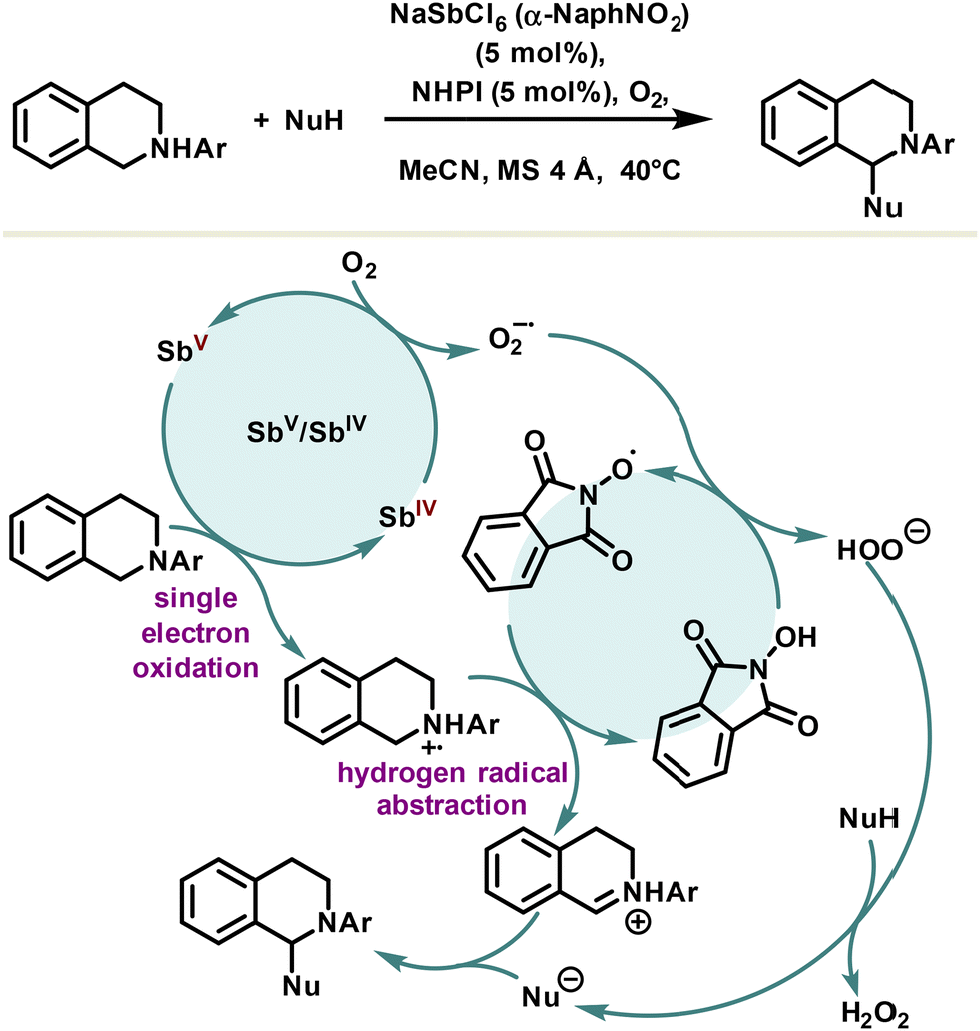 Cross-dehydrogenative coupling is an efficient tool for the creation of carbon–carbon bonds; however, the developed methodologies are largely based on transition metals. An alternative system using N-hydroxyphthalimide and a redox active antimonate salt, NaSbCl6, as a non-innocent counteranion co-catalyst was reported by the Kobayashi group for the aerobic cross-dehydrogenative coupling of N-tetrahydroisoquinolines (Scheme 18).105 Although the mechanism is not established, it is assumed that the single electron oxidation of tetrahydroisoquinolines is catalyzed by a hexachloroantimonate(V) anion providing an aminium radical cation. Aerobic condition leads to the reoxidation of the antimony(IV) species into an antimonate(V) anion catalyst and the formation of an oxygen radical anion. The latter abstracts subsequently the hydrogen of the N-hydroxyphthalimide, delivering the phthalimide N-oxide radical and the peroxide anion. Lastly, the aminium radical cation undergoes hydrogen radical abstraction to yield the iminium cation which readily reacts with nucleophiles to furnish the final cross-products. Overall, the antimony-based co-catalysis of cross-dehydrogenative coupling does not offer significant advantages compared to other metal-based systems. However, from a fundamental point of view, the implementation of redox-active antimonate counteranions in catalysis might lead to further investigation in this area. It should be noted, however, that a main challenge lies in the assessment of the catalytically active species, since halide antimony derivatives tend to disproportionate.