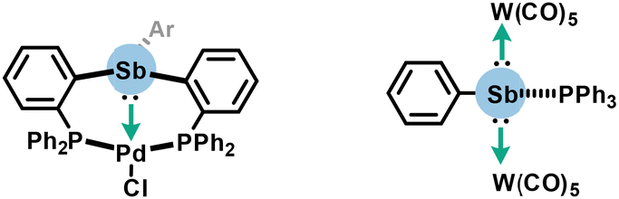 By extension to lighter pnictogens, organoantimony features a Lewis base character through its electron lone pair. This facet was historically identified with electron-rich stibines being able to react with various acids.38 This property was also clearly underlined in metallic complexes including triarylstibine and stibinidene, whose antimony free electron pairs are delocalized towards metal centers such as palladium or {W(CO)5} fragments, acting thus as L-type ligands (Scheme 1).39,40