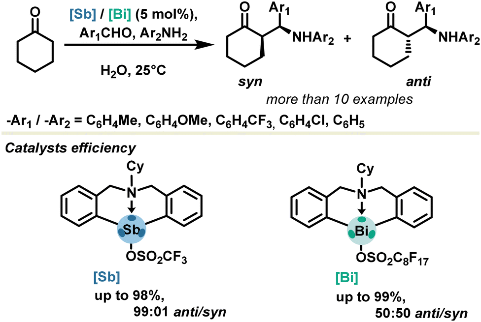Lewis acid properties of organoantimony in catalysis have been reported since the early 2000s, despite the absence of any model at that time. In 2010, the Wong group introduced an azastibocine perfluoroalkylsulfonate whose stability was attributed to an intramolecular pnictogen bond which simultaneously rigidifies the molecular scaffold (Scheme 2).46 This catalyst was successfully used in a highly diastereoselective Mannich reaction, leading to beta-amino ketones in sustainable solvents such as water. The catalytic activity was unequivocally attributed to the Lewis acidity of the antimony center, deepened by the perfluoroalkylsulfonate moiety. Importantly, no selectivity was observed with the organobismuth analogue, despite its catalytic efficiency.47