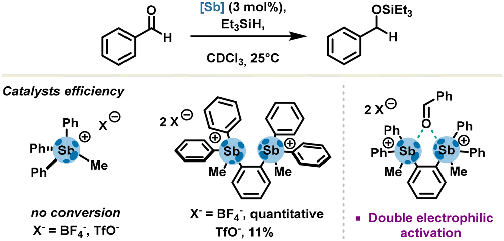 As established in a systematic study performed by Gabbaï's group in 2014, tetraarylstibonium salts are potent pnictogen bond donors and have a propensity to activate oxygen-based Lewis bases such as tetrahydrofuran. Capitalizing on these results, the same group reported activation and hydrosilylation of benzaldehyde derivatives with a bifunctional pnictogen bond donor bearing two triarylmethylstibonium cations. Unambiguously, the authors demonstrated a mechanism occurring via carbonyl activation, with a stronger catalytic effect ascribed to a double electrophilic activation due to the ditopic nature of distibonium salts (Scheme 3).