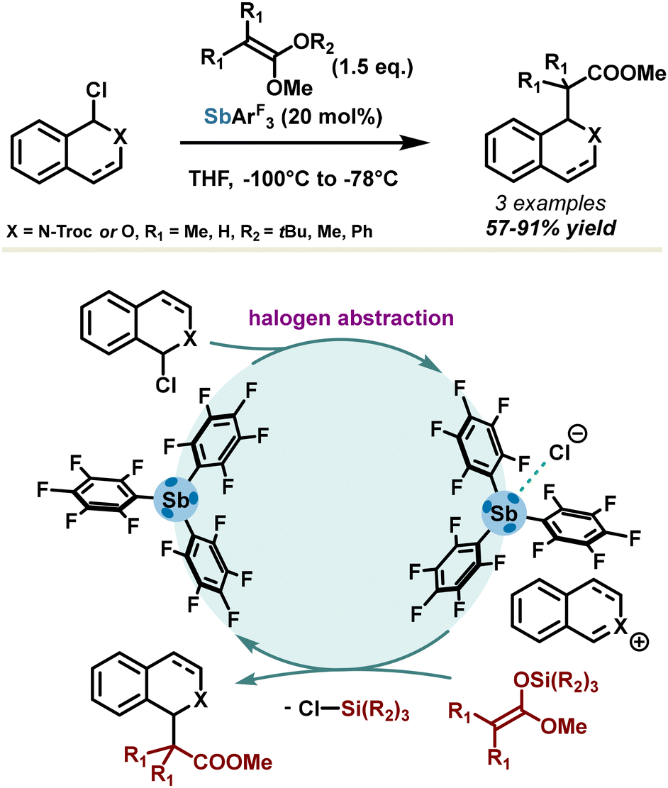 The pnictogen bond concept in catalysis was first introduced by the Matile group in 2018,49 in a comprehensive study establishing the direct relationship between catalytic activity, σ-hole depth, and polarizability of σ-hole donors. Due to a stronger polarizability, antimony-based σ-hole donors have demonstrated the best results in benchmark reactions such as Reissert-type substitution of isoquinolines and substitution of 1-chloroisochromane in the presence of silyl enol ether (Scheme 4). High yields (up to 91%) were obtained with 20 mol% of catalyst loadings. Due to the propensity of σ-hole donors to form strong adducts in the presence of halides, the asserted mechanism involves chloride abstraction, releasing a highly reactive onium ion which subsequently undergoes nucleophilic addition in the presence of the silyl enol ether. PnB surpassed halogen bonding and chalcogen bonding, affording a reaction rate increase from 3 to 80-fold. As expected, substitution of stibine with highly electron-withdrawing pentafluorophenyl motifs led to the best catalytic activity, with a σ-hole deepening of 39% in comparison with triphenylstibine.