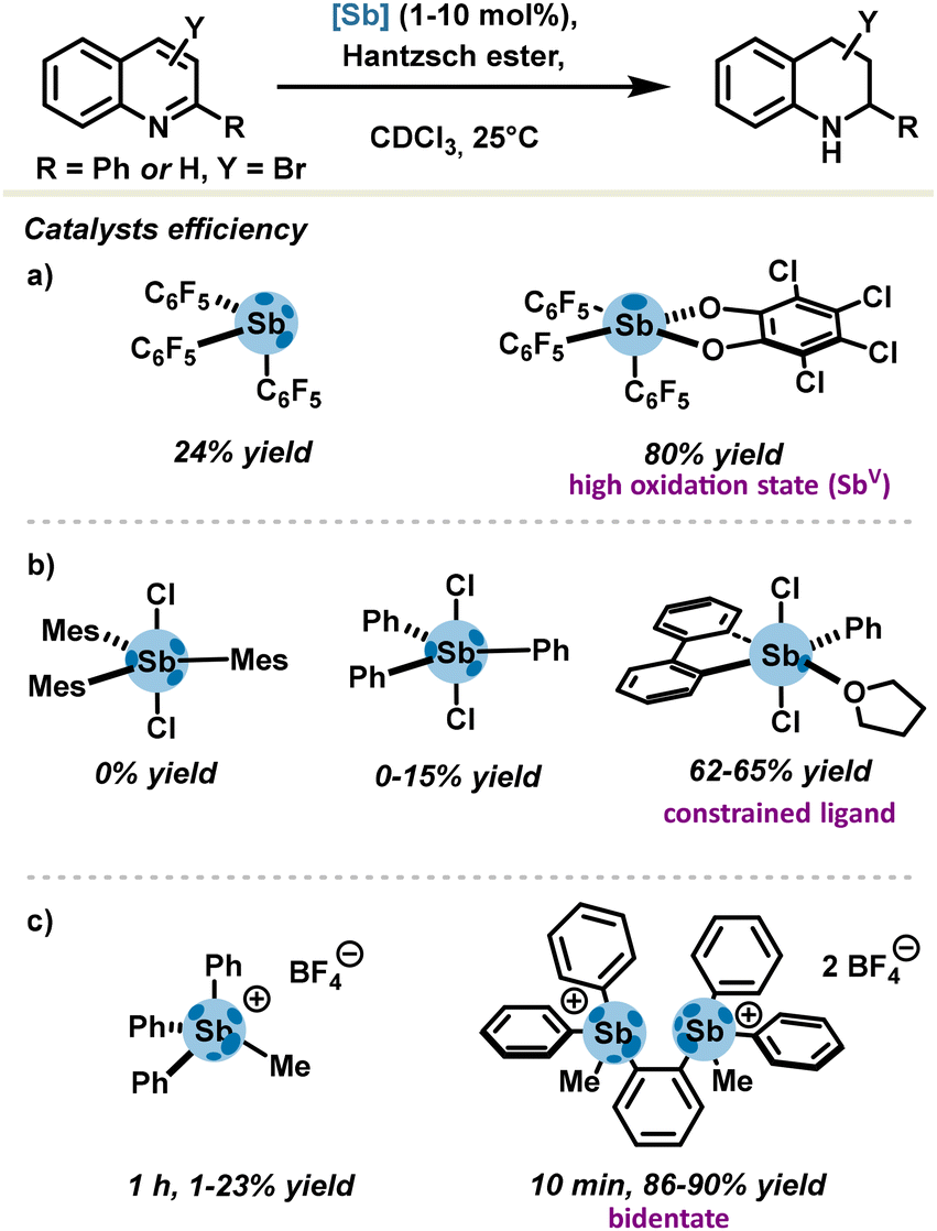 In continuation of these pioneering groundworks, an additional series of antimony-based catalysts were developed on the basis of the PnB rationale. In view of strengthening σ-holes, features such as positive charge at the antimony center, a strong electron-withdrawing motif, a high oxidation state (+V) and bidentate motifs were targeted. In order to evaluate new pnictogen bond donors, transfer hydrogenation of quinolines with Hantzsch ester was recurrently selected as a standard benchmark reaction due to its proven responsiveness towards σ-hole-directed catalysis (Scheme 5).50