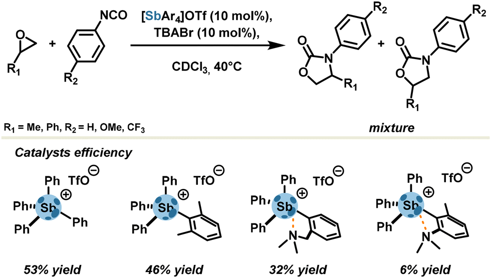 Even though stibonium salts do not suffer much strain energy re-organization, ligand motifs sometimes lead to a reduced catalytic activity due to the tethering effect. In another systematic study, Gabbaï's group examined the influence of steric hindrance around the Sb center within a series of tetraarylstibonium triflates (Scheme 6).52 Unhindered tetraphenylstibonium triflate, with 10 mol% catalyst loading, achieved a good yield (53%) in a model cycloaddition reaction between oxiranes and isocyanates affording oxazolidinones as a mixture of two regioisomers. Steric tethering of σ-holes with methyl motifs led to a slight deterioration of the yield (46%). In contrast, the presence of σ-hole stopper motifs, namely intramolecular σ-hole acceptor motifs, drastically diminished yields up to 6% by preventing any possibility of establishing an external pnictogen bond.