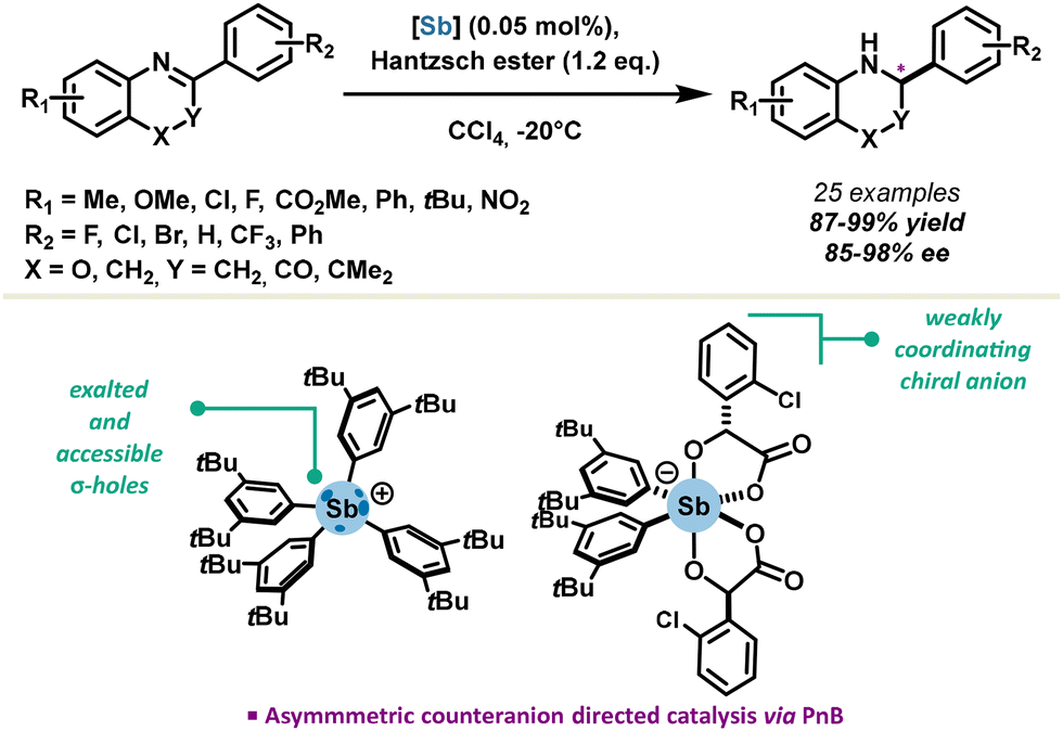 In the context of asymmetric catalysis, the Zhang group achieved a significant foray in 2021, reporting the first stable stibonium stiborate salt in enantiocontrolled transfer hydrogenation reactions.54 A variety of substrates such as quinolines, benzoxazines and benzoxazinones were reduced in excellent yields, with catalyst loadings as low as 0.05 mol%. Enantioselectivity up to 98% ee could be achieved via an asymmetric-counter-ion-directed-catalysis mechanism due to a weakly coordinating chiral stiborate anion (Scheme 7). This is the first example of chiral induction with antimony-based PnB, which paves the way towards further development of chiral PnB catalysts. One major challenge remains to be the introduction of chirality directly on the σ-hole donor, providing access to a putative class of neutral chiral pnictogen bond donors.