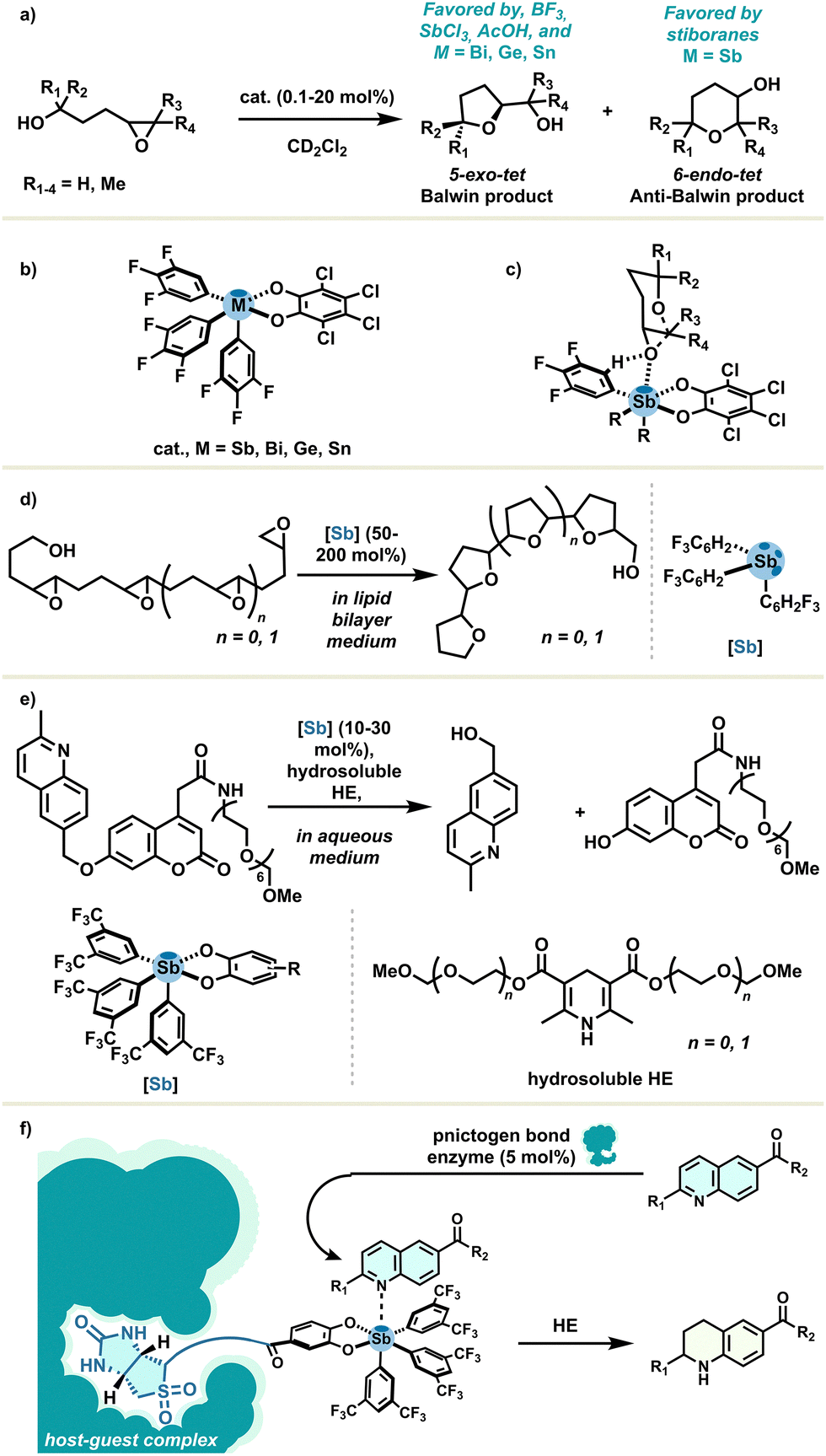 As extensively exemplified by the Matile group, the emergence and importance of organoantimony in the field of catalysis might also be attributed to its unique features, which are certainly more than just extensions of other σ-hole donors. As a first incursion, epoxide-opening polyether cascade cyclisations were systematically studied and used as a responsive tool for supramolecular catalysis assessment.33 PnB catalysis distinctively provided 6-endo-tet anti-Baldwin products, with important variations between stibines and stiboranes as PnB catalysts regarding regio- and stereoselectivity. A cyclisation reaction example is depicted with a simple monoepoxide reagent in Scheme 8(a), catalyzed by several Lewis acids (Scheme 8(b)). Covalent Lewis acid catalysis reasonably led to the Baldwin product, with Lewis acids such as BF3 or SbCl3 as well as other σ-hole donors based on bismuth, tin or germanium.32 This peculiar reactivity may be attributed to multi-supramolecular coordination enabled by hydrogen bonding, PnB and lonepair–π interactions in the presence of polyepoxide substrates. By contrast, the previously cited interactions, combined with the highly acidic Sb center and the hydrophobic platform of stiboranes, lead to a possible catalyst–substrate complex giving rise to this unorthodox selectivity (Scheme 8(c)). This underlying mechanism was investigated and proposed later on.55 These lessons on antimony catalysis led authors to describe PnB catalysis as the non-covalent supramolecular counterpart of classical covalent Lewis acid catalysis.