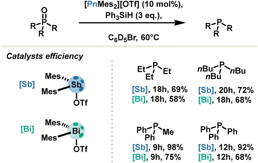 Trivalent antimony also has its place in pnictogen bond catalysis: for illustration, the Venugopal group reported in 2021 the efficient reduction of oxide phosphine into corresponding phosphine under mild conditions with silane as the hydrogen source. The catalyst, a stibenium triflate, was used with 10 mol% loading and achieved up to 92% yield. Remarkably, stibenium salt proved to be more effective with respect to bismuthenium salt (Scheme 9).59 This observation was correlated with computational calculations revealing a LUMO lowered in energy for antimony derivatives.