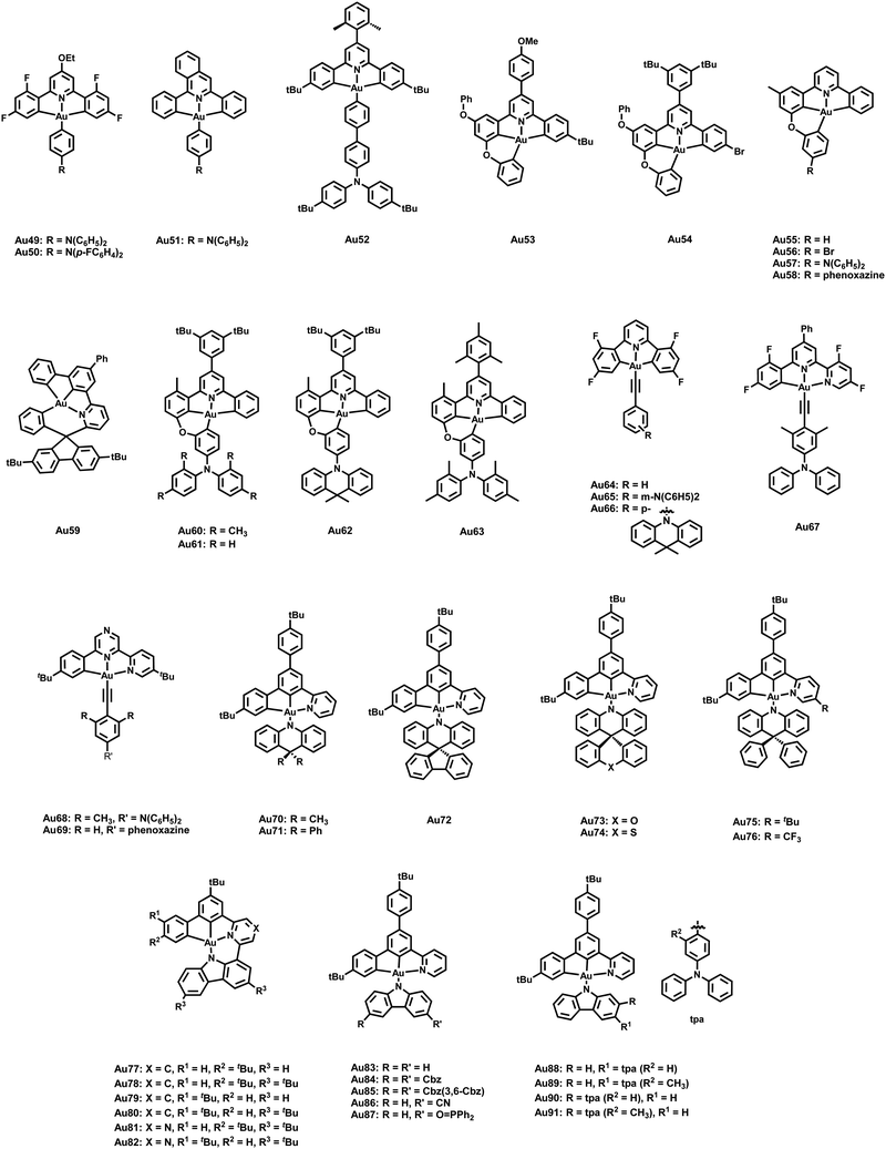 Several novel carbazolyl Au(III) dendrimers containing C^C^N ligands (Au83–85; Scheme 5) has been developed and synthesized. Exceptionally high PLQY reaching up to 82% in thin-films, along with large radiative decay rate constants on the order of 105 s−1, have been observed – Table 7. These Au(III) dendrimers demonstrate TADF, supported by time-resolved photoluminescence decay and computational investigations, with estimated ΔEST values of ca. 32 cm−1. OLEDs based on these Au(III) dendrimers were successfully fabricated via solution processing. These OLEDs achieved current efficacies of 52.6 cd A−1, EQEmax of 15.8%, and substantial power efficiency of 41.3 lm W−1 – Table 6. Furthermore, the operational stability of these OLEDs was evaluated, revealing remarkable results. The devices utilizing zero- and second-generation dendrimers showed maximum half-lifetimes of 1305 and 322 h at 100 cd m−2, respectively. This pioneering work demonstrates the application of Au(III) dendrimers in operationally stable solution-processed OLEDs.313