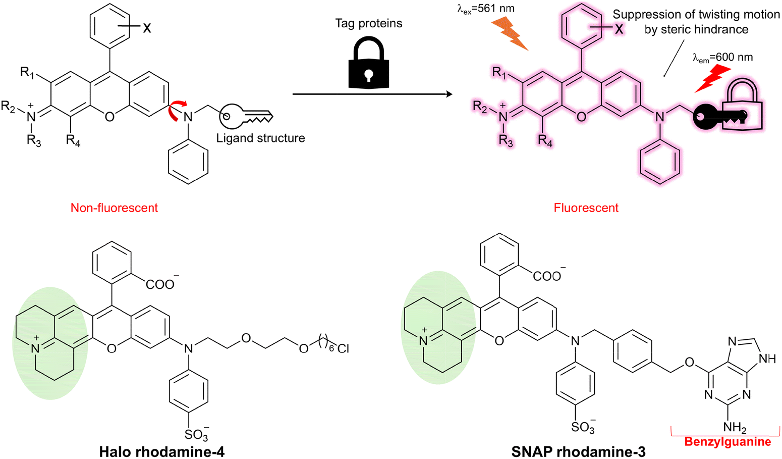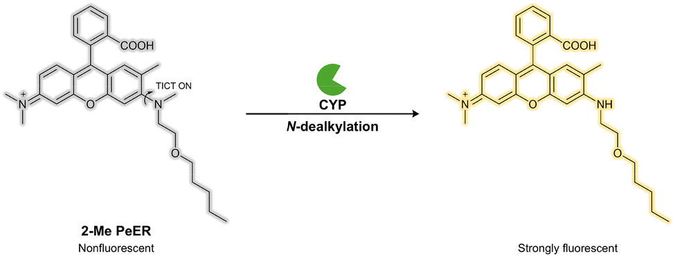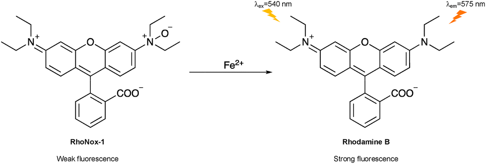 Hirayama et al. developed an activity-based switch-on fluorescent probe (RhoNox-1) for Fe2+ detection and imaging (Fig. 10), based on a rhodamine fluorophore. The tertiary amine N-oxide group in RhoNox-1 is not conjugated with the π-system of the fluorophore, as it lacks a lone pair. This led to a blue shift in the absorption spectrum of RhoNox-1 compared to the parent fluorophore, rhodamine B. The presence of the N-oxide group also resulted in only weak emission from RhoNox-1 due to TICT. Fe2+ can mediate the reductive deoxygenation of the N-oxide group, unmasking a tertiary amine group and thereby resulting in a strong and selective fluorescence response. RhoNox-1 was also used to image basal and endogenous labile Fe2+ in living HepG2 cells. However, RhoNox-1 exhibited pH dependence within a physiological pH range.64