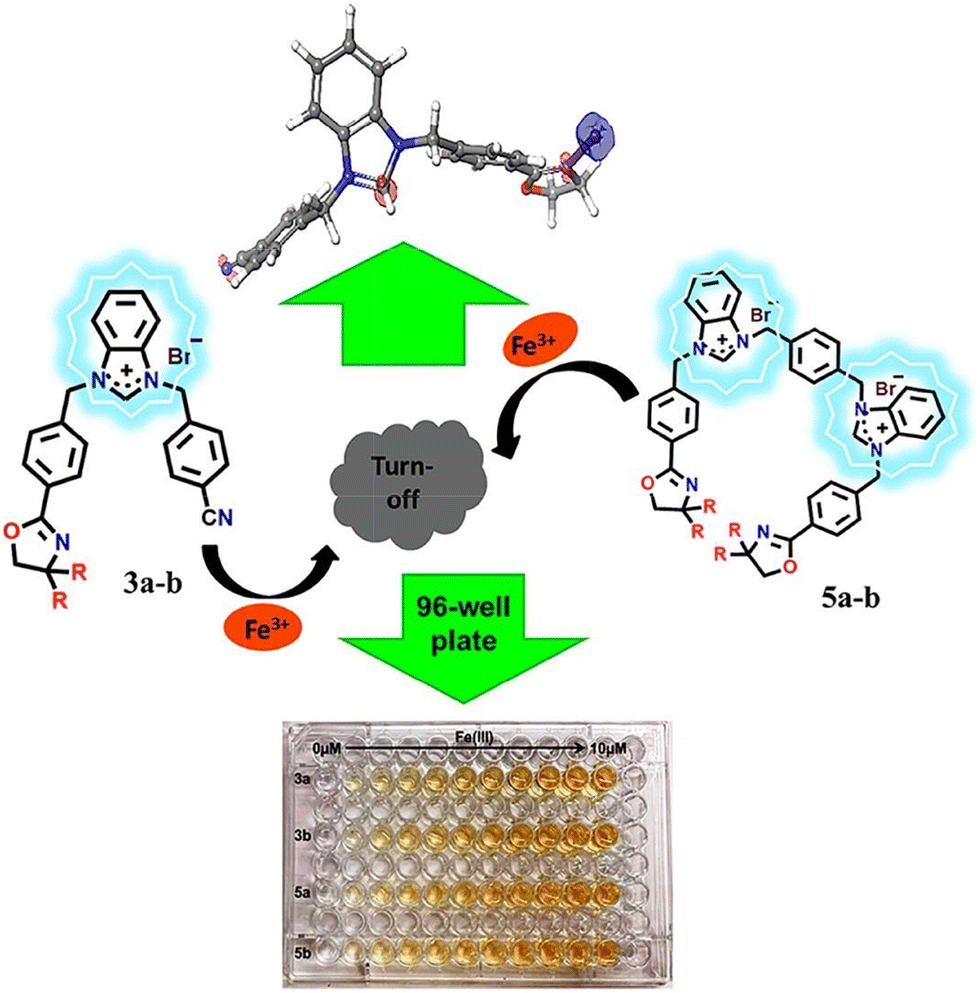 Lamoria et al. designed a series of fluorescent and colorimetric turn-off probes (3a–b and 5a–b) based on benzimidazolium or bis(benzimidazolium) motifs as electron acceptors with oxazolines as response sites and electron donors (Fig. 11). Due to the perpendicular arrangement of oxazoline and benzimidazolium, the TICT phenomenon occurred and led to large Stokes shifts of 3a–b and 5a–b with emissions at about 367 nm in water. Upon the addition of Fe3+, 3a–b and 5a–b can form a complex, which resulted in the fluorescence quenching of 3a–b and 5a–b. These probes were used to detect Fe3+ fluorocolorimetrically in real water samples.65