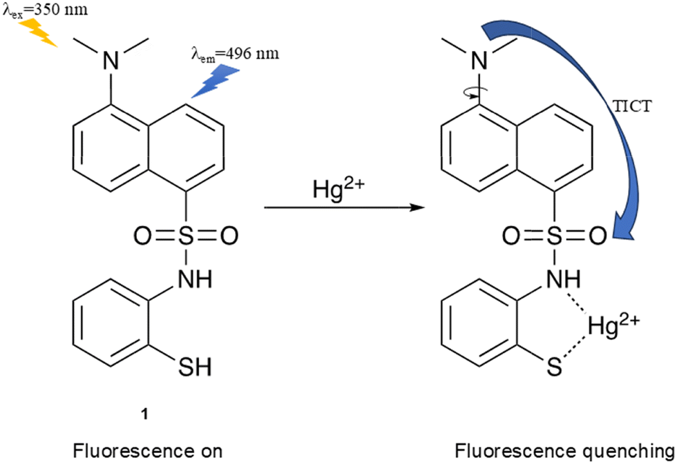 Tharmaraj et al. designed a turn-off colorimetric and fluorescent probe (1) with a dansyl core linked with a sulfonamide–thiophenol motif as the binding site for Hg2+ (Fig. 12). Upon the addition of Hg2+, N,S-chelation occurred. TD-DFT calculations indicated separated charge distributions between the HOMO and LUMO of the complex of Probe 1 and Hg2+. Specifically, the HOMO was localised on the N,N′-dimethylaminonaphthyl group whereas the LUMO was primarily localised on the thiophenol ring and sulfonamide group. Thus, when excited, electron transfer from the N,N′-dimethylaminonaphthyl donor to the sulfonamide–thiophenol acceptor occurred. Given the TICT process was switched on, the fluorescence of 1 was quenched upon Hg2+ complexation. The probe was used to detect Hg2+ in real water samples with excellent selectivity over other metal ions.72