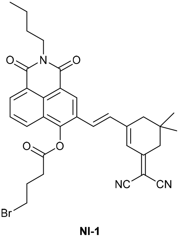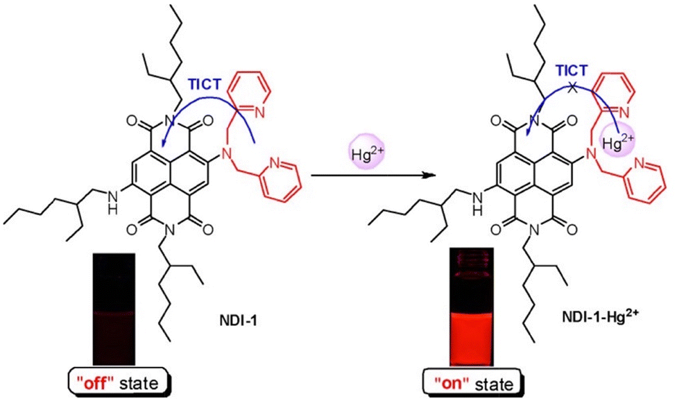 Li et al. selected a naphthalenediimide as a reporter motif connected to a di-2-picolylamine as a receptor motif for Hg2+ to obtain a near-infrared (NIR) fluorescent probe (NDI-1) (Fig. 13). An alkylamine was appended to the NDI core as a strong electron donor to extend the push–pull system, to tune the emission to the NIR region. Due to the TICT mechanism, NDI-1 was nearly non fluorescent. However, after Hg2+ complexed with the di-2-picolylamine group, the electron donating ability of the di-2-picolylamine group was attenuated. At the same time, the dihedral angle between the naphthalenedimide core and the di-2-picolylamine group increased, which inhibited the TICT process and resulted in strong red-to-NIR emission. The probe was successfully used to image Hg2+ in live HeLa cells.73