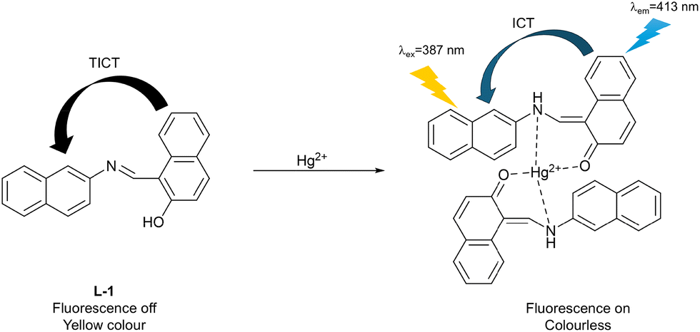 Zhang et al. developed a TICT-based fluorescent probe (L-1) with both colorimetric and fluorescence channels for Hg2+ detection (Fig. 14). The probe consisted of two naphthalene Schiff bases as reporter motifs and a combination of hydroxyl and imine groups as the coordinating groups. The TICT process resulted in an “off” state of fluorescence for L-1. However, when Hg2+ coordinated with the hydroxyl and imine groups of L-1, Zhang et al. propose that the relative orientation of the two naphthalene groups was altered. This led to reduced electron transfer and contributed to the formation of the coplanar conjugated system. As such the inhibition of the TICT process and promotion of the ICT process resulted in the appearance of a strong blue fluorescence and a colour change of the solution from yellow to nearly clear.74