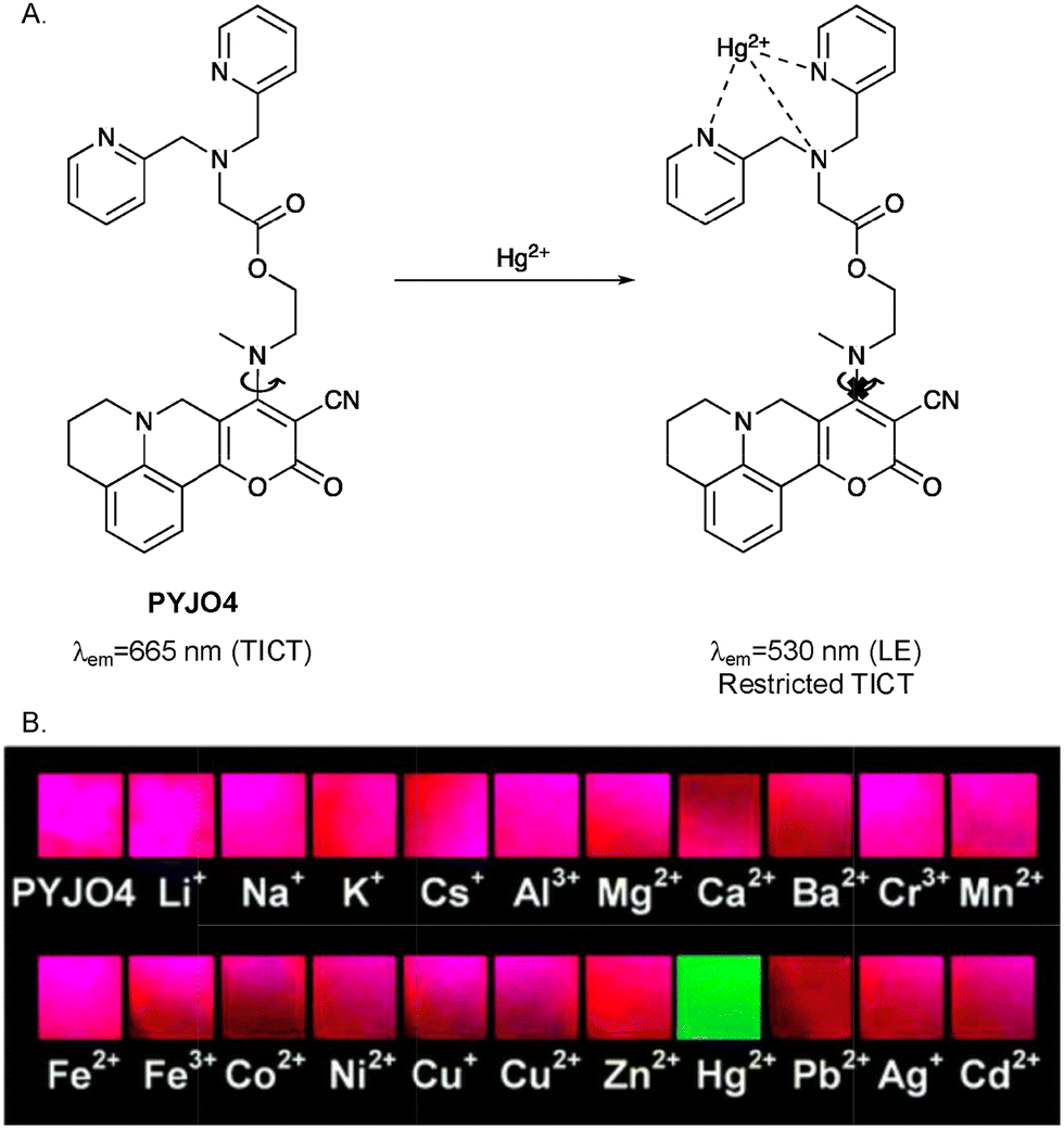 Jha et al. developed a pyrano[3,2-c]julolidine-2-one-based ratiometric fluorescent probe (PYJO4) to coat test strips to detect Hg2+ in aqueous solution and image Hg2+ in living cancer cells (Fig. 15). The probe exhibited an emission at 530 nm due to the LE state and another stronger emission at 665 nm due to the TICT state. After Hg2+ bound with the dipicolylamine receptor, the conformation reportedly changed from the twisted state to a planar state and inhibition of the TICT process resulted in an enhanced fluorescence emission at 530 nm and a decreased fluorescence emission at 665 nm. Meanwhile, detection by PYJO4 was reversible, through the addition of potassium iodide (KI) solution. Since I− has a high affinity for Hg2+, forming [HgI4]2−, the coordination of PYJO4 with Hg2+ is reversed when KI was added. Over a pH range from 5 to 9, the probe response was pH-independent. Moreover, PYJO4 coated test strips could be used to detect concentrations as low as 200 ppb Hg2+, which implies great potential for monitoring Hg2+ in aqueous environmental samples.75
