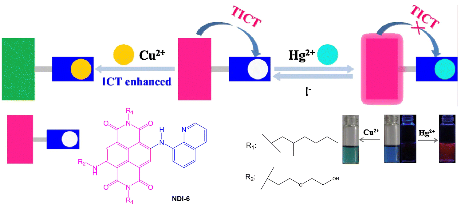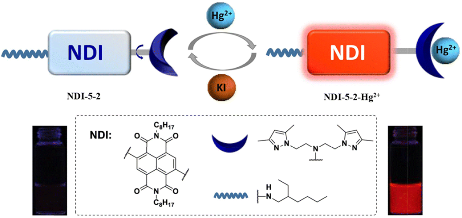 Zong et al. designed a switch-on fluorescent probe (NDI-5-2) based on a naphthalenediimide fluorophore with a bis(2-(3,5-dimethylpyrazol-1-yl)ethyl)amine binding site for Hg2+ (Fig. 16). The TICT process resulted in weak fluorescence emission of NDI-5-2. However, on the addition of Hg2+, a complex between NDI-5-2 and Hg2+ was formed, and the fluorescence quantum yield increased from 0.28% to 8.83%. In addition to a strong red emission at 651 nm, the probe also exhibited excellent sensitivity, with a limit of detection of 1.3 µmol L−1. In addition, the reversibility of NDI-5-2 coated test strips was confirmed by adding KI. Since I− has a high affinity for Hg2+, forming [HgI4]2−, the coordination of NDI-5-2 with Hg2+ is reversed when KI was added. In living MCF-7 cells, NDI-5-2 exhibited good cell permeability for the imaging of Hg2+.76