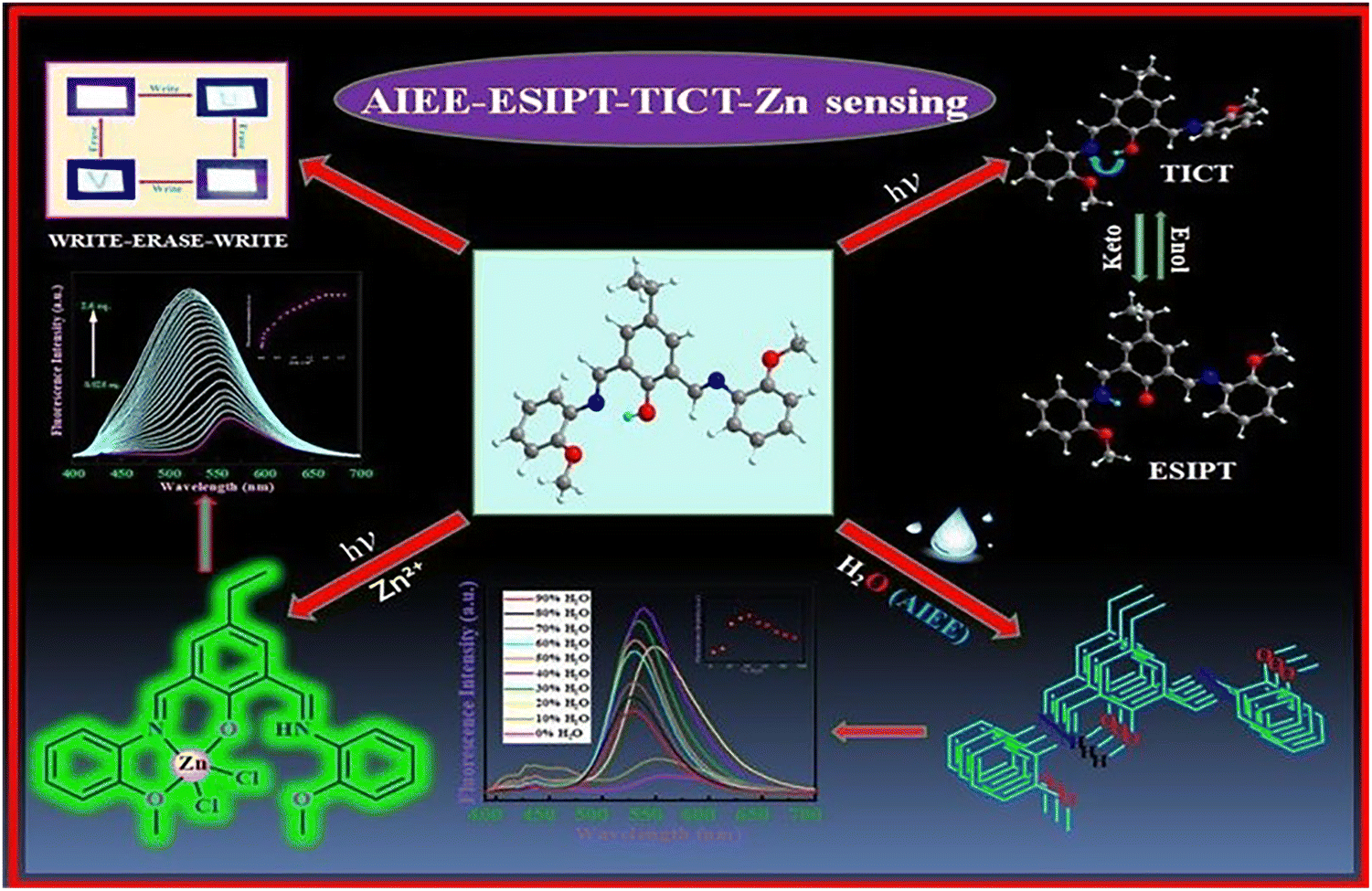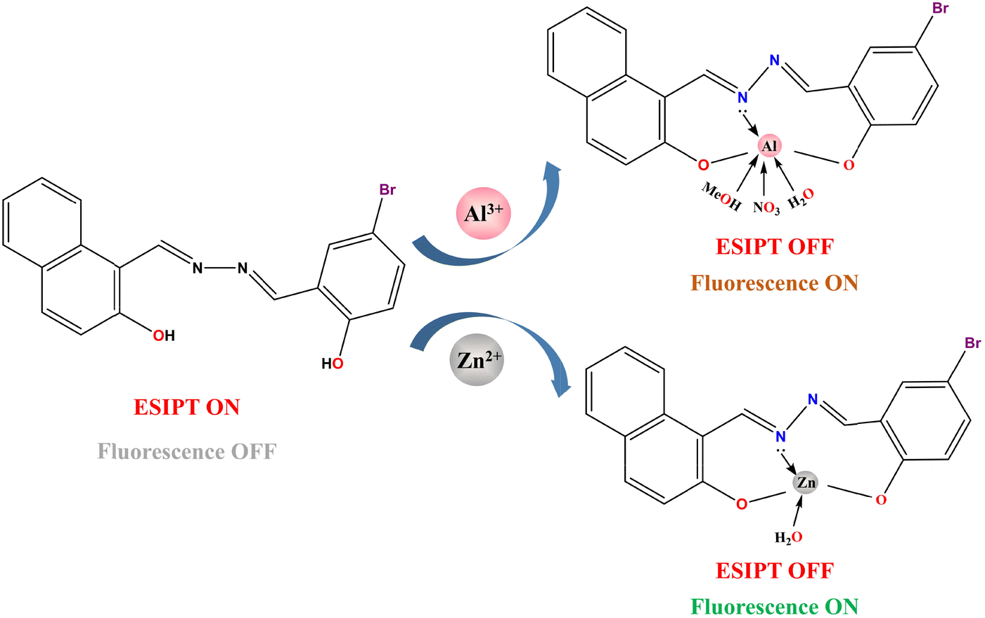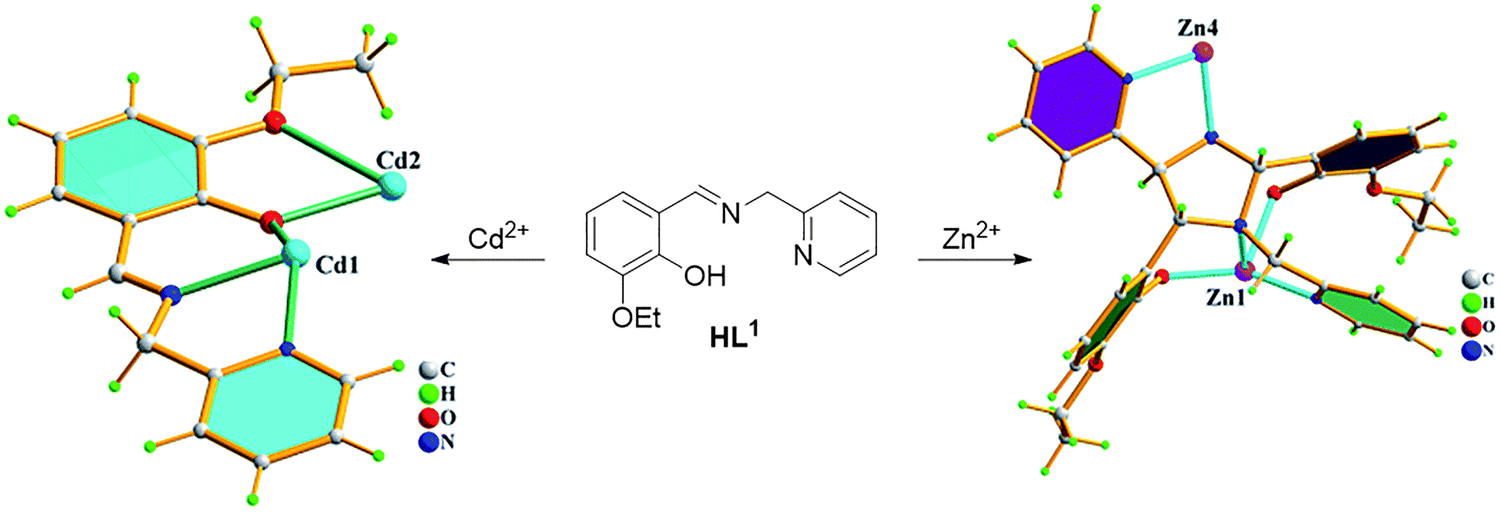 Zheng et al. developed a fluorescent probe (HL1) based on two Schiff bases for Zn2+ detection (Fig. 17). Upon the addition of Zn2+, the two nitrogen atoms and the hydroxyl oxygen formed a tridentate complex. The pyridine ring and the phenyl ring of the HL1-Zn2+ complex were nearly orthogonal, as shown by X-ray crystallography. The presence of the ethoxy group as an electron donor induced TICT, with this zinc complex exhibiting an emission maximum at 493 nm. However, due to the similar electronic configurations of Zn2+ and Cd2+, HL1 can also respond to Cd2+ although in this case emission is from the LE state. Notably, the X-ray structure of the HL1-Cd2+ complex shows the pyridine and phenyl rings to be near coplanar in the solid state. When excited at 350 nm in ethanol, the fluorescence emission of HL1 changes from 463 nm to 493 nm upon the addition of Zn2+. With higher concentrations of Zn2+, the fluorescence intensity at 493 nm increased linearly. The limit of detection for Zn2+ was 1.11 µM. By comparison, the addition of Cd2+, HL1 gave fluorescence with an emission maximum at 463 nm (i.e. no red-shift due to TICT) and the limit of detection for Cd2+ was 9.2 µM.82