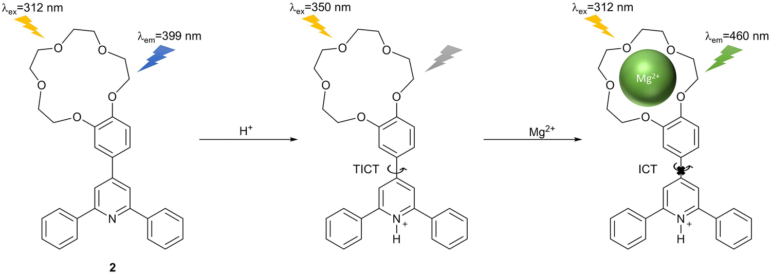 Liu et al. selected a biarylpyridine as the fluorophore and a crown ether group as the response site to obtain an ON–OFF–ON fluorescent probe 2 triggered by protons for Mg2+ detection (Fig. 18). When excited at 312 nm, the probe had a fluorescence response at 399 nm. If alkali or alkaline earth cations were added directly, a blue shift of the probe's emission and decrease in fluorescence intensity was observed, coupled with reduced selectivity towards Mg2+. However, upon the addition of Brønsted acid, the fluorescence emission of the probe at 399 nm was quenched due to activation of the TICT process. After subsequent coordination of Mg2+ with the crown ether group of the probe, the TICT process was inhibited, and the ICT process was activated. The complex exhibited a strong fluorescence emission at 460 nm and excellent selectivity towards Mg2+ over other alkali and alkaline earth cations.85