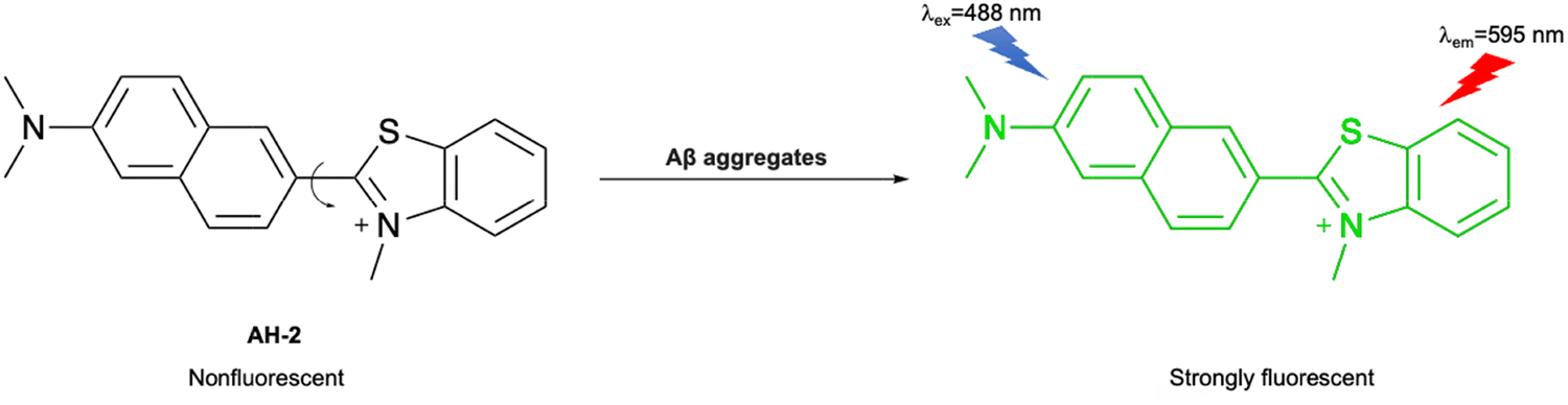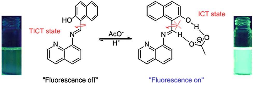 Lin et al. developed a reversible fluorescent probe (LX) based on a naphthalene and quinoline fluorophore for AcO− detection (Fig. 19). The unbound state of the probe exhibited TICT and resulted in an “off” state of fluorescence. However, Lin et al. propose that after AcO− interacted with the hydroxyl and imine groups of LX through hydrogen bonding, the imine C–C bond rotation was inhibited. So, the TICT process was switched to an ICT process with the observation of a strong fluorescence signal with an emission maximum at 520 nm when excited at 435 nm in DMSO solution. The addition of H+ can disrupt the hydrogen bonds between AcO− and LX, which recovered the TICT state and reduced the fluorescence, demonstrating reversibility. The probe exhibited excellent sensitivity towards AcO− with a detection limit of 0.4 µM.88