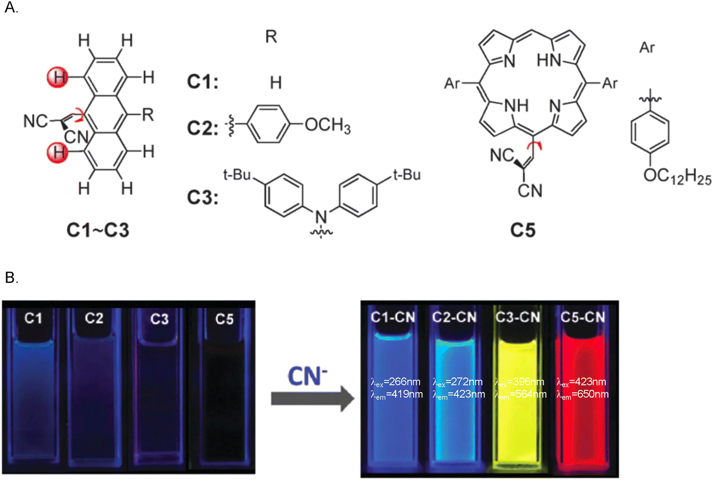 Chen et al. selected a 9-anthryl fluorophore and a dicyanovinyl group as the response site for CN− to synthesize a series of activity-based turn-on fluorescent probes (C1–C3) (Fig. 20). Due to steric crowding, the dicyanovinyl group was twisted and the fluorescence of C1–C3 was quenched due to the TICT process. However, the addition of CN− resulted in the formation of adducts by conjugate addition to the dicyanovinyl motif. In these adducts, the TICT process was suppressed, which favoured emission from the LE state. For C3, the fluorescence was enhanced by about 242-fold upon the addition of CN−. At the same time, C3 exhibited excellent sensitivity towards CN− with a detection limit of 1.14 µM, which is below the safe CN− level for drinking water set by the WHO. Chen et al. also exchanged the 9-anthryl fluorophore for a porphyrin group, another kind of π-conjugated skeleton, to produce probe C5. Porphyrin C5 exhibited weak fluorescence similar to C1–C3. Upon the addition of CN−, the fluorescence emission was once again enhanced. The introduction of different electron donors and different π-conjugated skeletons was shown to modulate the emission wavelengths of the probe-cyanide adducts from blue to red.91