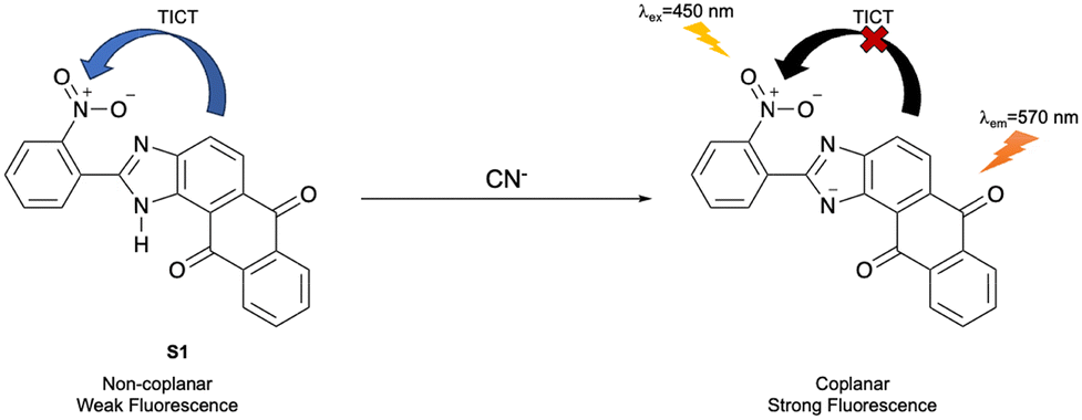 Balamurugan et al. developed a ratiometric turn-on fluorescent probe (S1) based on an imidazoanthraquinone for detecting CN− (Fig. 21). The nitro group in the o-position and the N–H of the imidazole moiety hindered the adoption of a coplanar conformation around the biaryl bond. Thus, the TICT process was operative, with donation from the electron rich imidazoanthraquinone moiety to the electron poor nitrophenyl group, resulting in only weak fluorescence emission at 554 nm for S1. The addition of CN− can deprotonate the imidazole N–H of S1 to give the corresponding anion that can achieve co-planarity, and which has enhanced electron density for the imidazoanthraquinone moiety, resulting in inhibition of the TICT process and a red shift in the fluorescence, with strong emission at 570 nm being observed. S1 exhibited excellent sensitivity and selectivity towards CN− when used with real waste samples. Additionally, the probe also exhibited good cell permeability for imaging CN− in living RAW264.7 cells.92