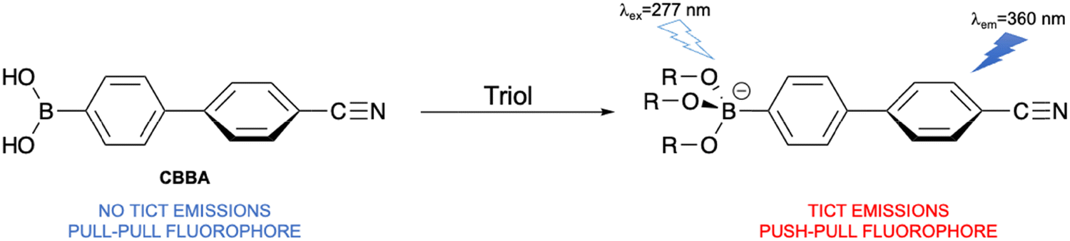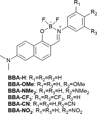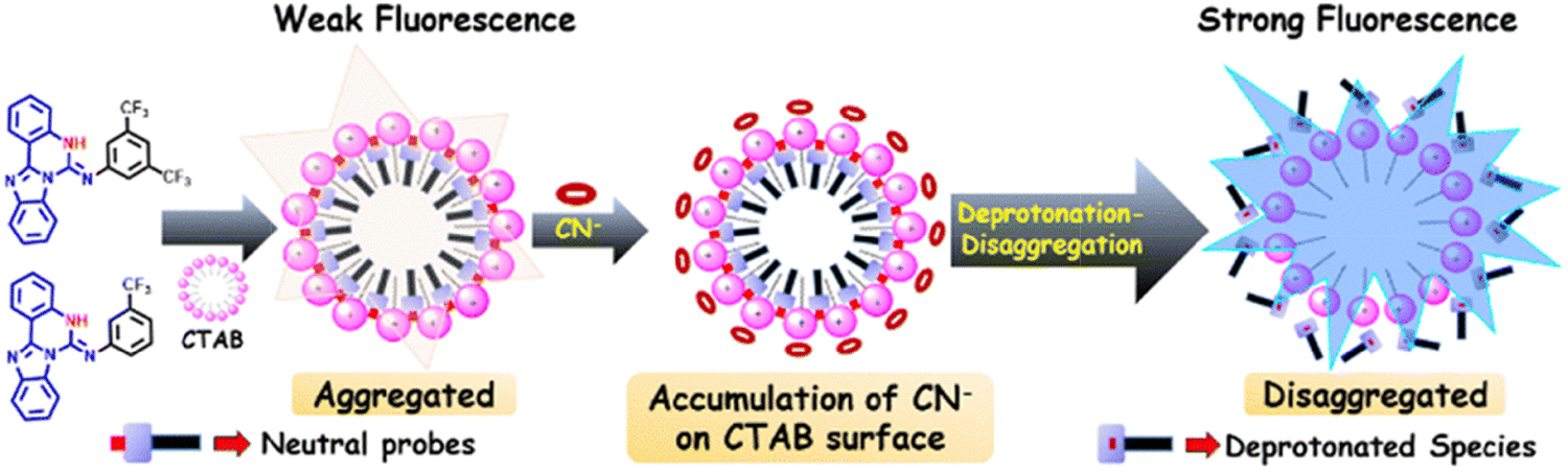 Pegu and Das developed two self-assembled nano fluorescent probes (Benz-d-CF3 and Benz-m-CF3) for CN− detection in conjunction with cetyltrimethylammonium bromide (CTAB) (Fig. 22). These probes consisted of quinazoline-fused benzimidazole skeletons with two different phenyl substituents to impart donor–acceptor characteristics. The C–N single bond of the phenyl substituents reportedly can twist and hence these probes exhibit TICT properties. In aqueous solutions containing CTAB, the two probes dispersed readily in water. Hydrogen bonding interaction and π–π interaction helped to self-assemble the nano aggregates. At the same time, the TICT process resulted in an almost complete quenching of the fluorescence of the probes. Upon the addition of CN−, disaggregation of the nano aggregates reportedly occurs. The authors state that co-planarity is therefore achieved leading to an enhancement of the ICT process and an enhanced fluorescence emission at 460 nm for Benz-d-CF3 and 485 nm for Benz-m-CF3 when excited at 365 nm. Besides, the detection of CN− when using Benz-d-CF3 and Benz-m-CF3 was shown to be reversible upon addition of Cu2+. When Benz-m-CF3 was used for the analysis of drinking water samples, excellent selectivity and sensitivity towards CN− with a detect limit of 496.5 nM was observed.93