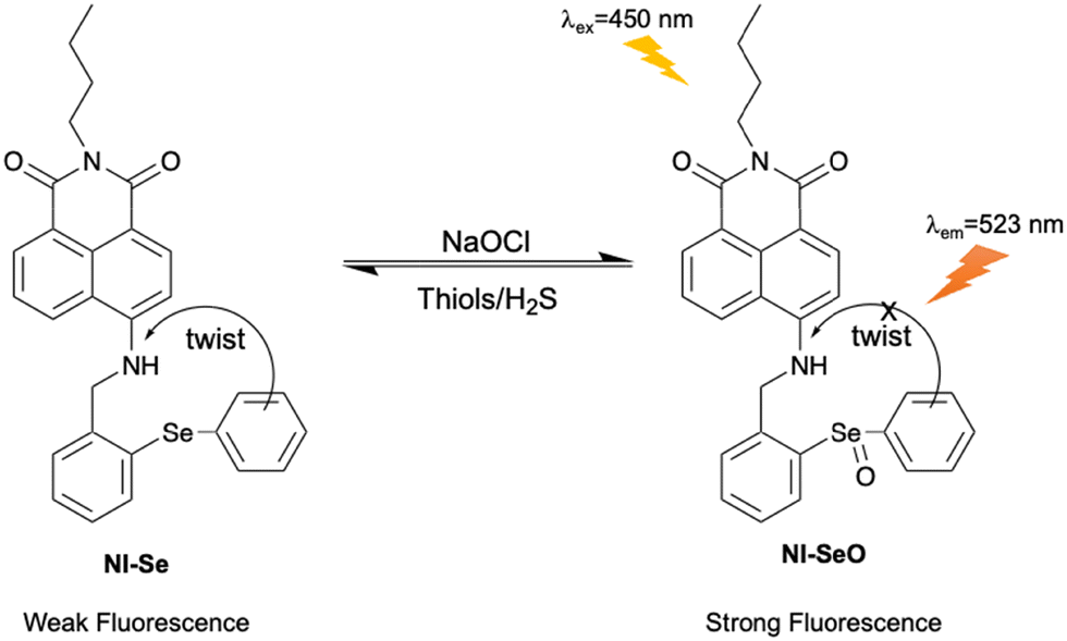 Lou et al. developed a reversible fluorescent probe (NI-Se) for HClO detection in vivo. The probe consisted of a 1,8-naphthalimide fluorophore and a selenide as the response site towards HClO (Fig. 23). The oxidation–reduction cycles between the selenium group with ROS and glutathione (GSH) facilitated reversible detection. The Se⋯N nonbonding interaction was enhanced in the excited state, which contributed to the intramolecular twisting. The on state of the TICT process quenched the fluorescence of NI-Se. However, upon the addition of HClO, the oxidation of the selenide to the corresponding selenoxide inhibited the Se⋯N nonbonding interactions as well as the TICT process, leading to the recovery of fluorescence emission. The detection process was shown to be reversible by addition of thiols or H2S. In addition, NI-Se exhibited low cytotoxicity when used to image HClO in living RAW264.7 cells, and was used for the visualization of HClO and the repair by antioxidants in an LPS (lipopolysaccharide) mouse model.102,103