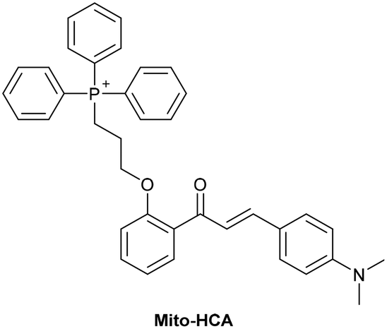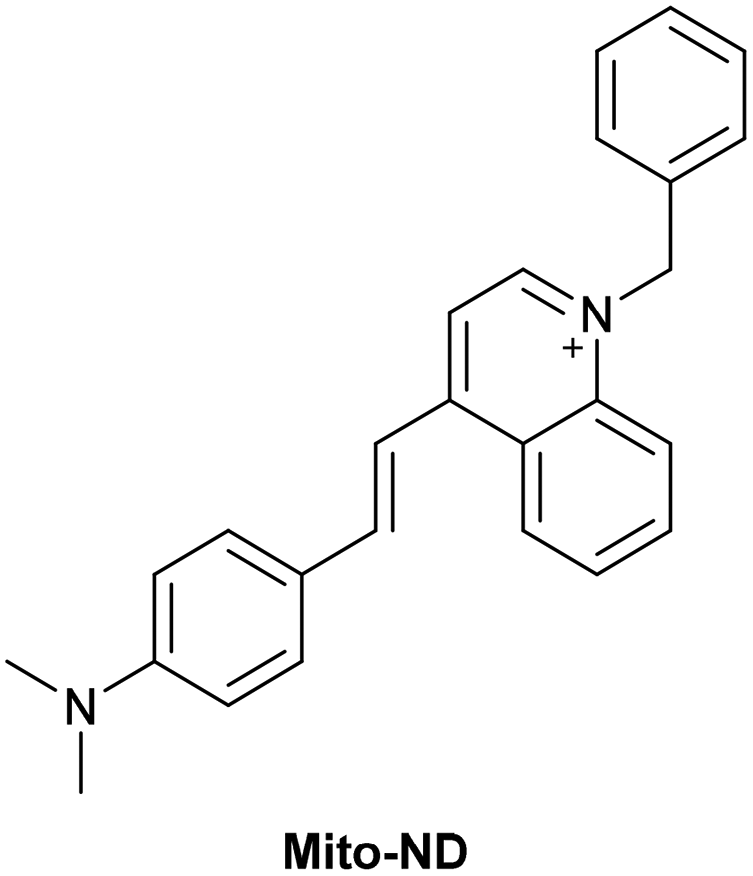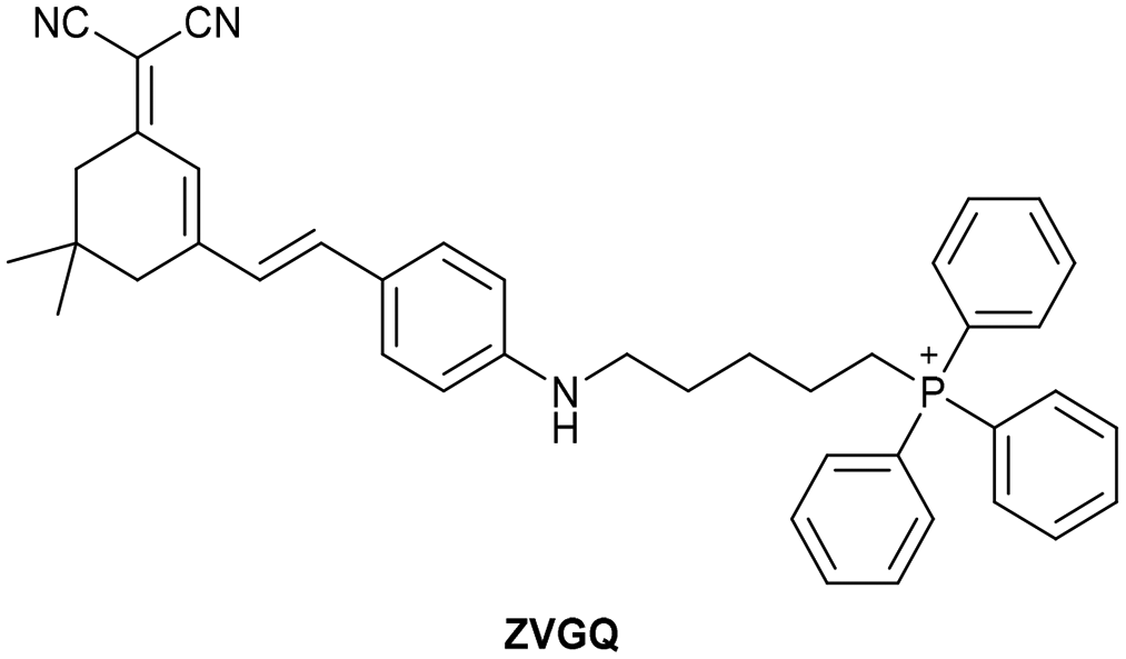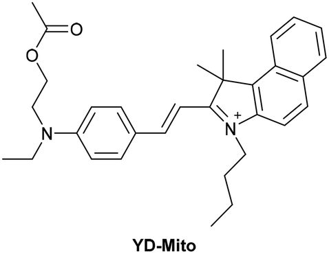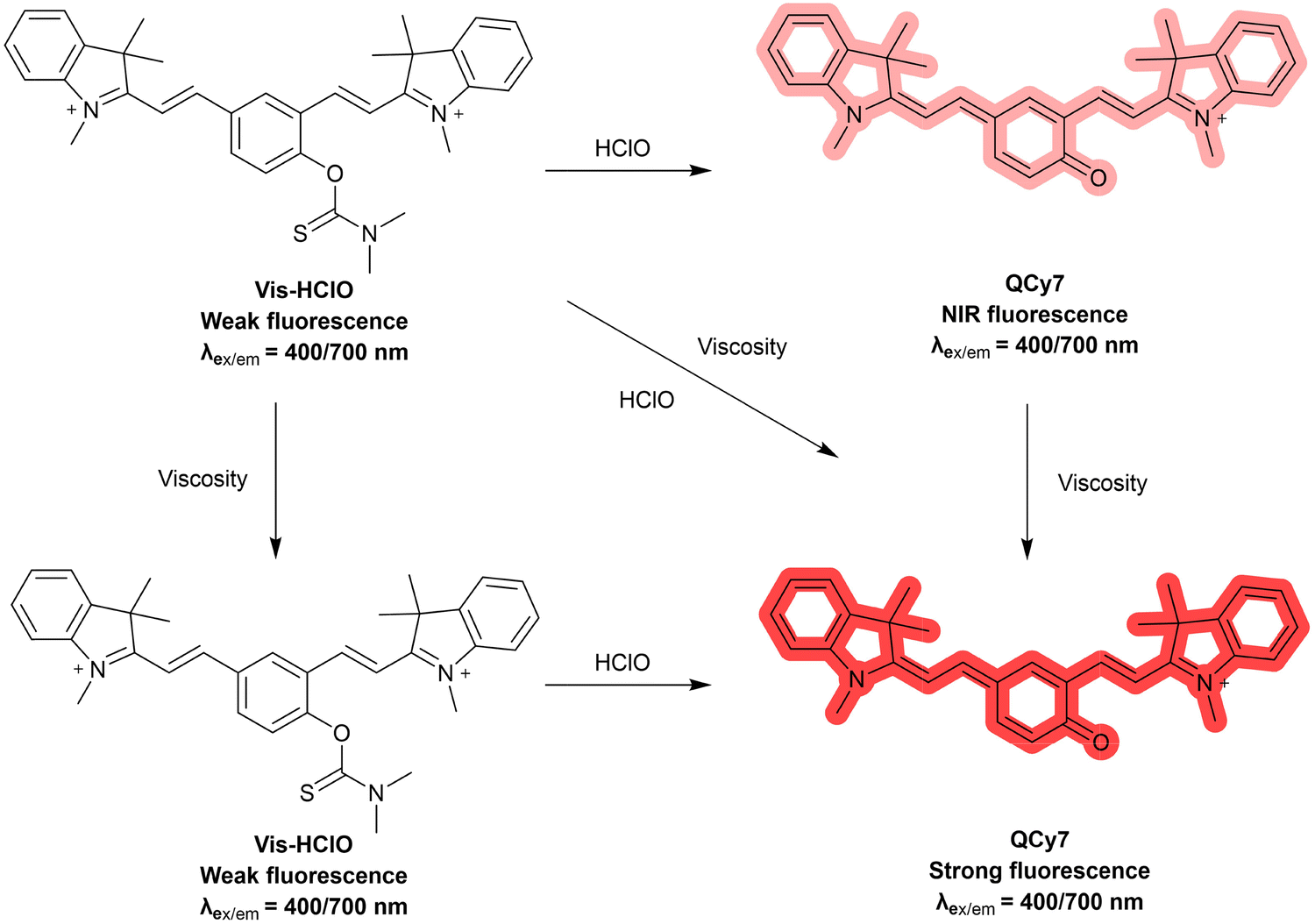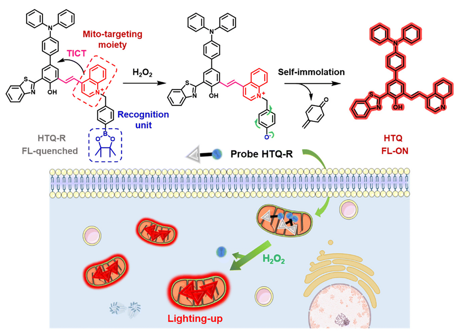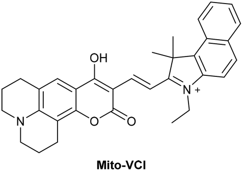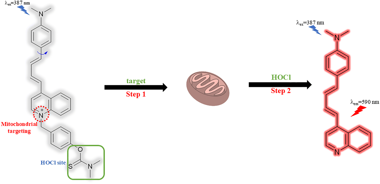 Mu et al. designed a mitochondrial-targeted fluorescent probe (Mito-QL) for detecting HClO with a large Stokes shift of 203 nm (Fig. 24). The probe was non-fluorescent due to the TICT effect between the dimethylaniline group and the quinolinium moiety. The addition of HClO resulted in the hydrolysis of the N,N-dimethylthiocarbamate moiety and revealed the fluorophore with strong red fluorescence emission at 590 nm when excited at 387 nm due to the ICT process. Mito-QL was demonstrated to have mitochondrial targeting ability and was able to image exogenous and endogenous HClO in the mitochondria of living cells. The positive charge on the nitrogen results in a mitochondrial targeting group between the fluorophore and response site to HClO, and avoided off target fluorescence interference. It was also shown that Mito-QL could be used to monitor HOCl during ferroptosis caused by ROS-induced lipid peroxidation.104