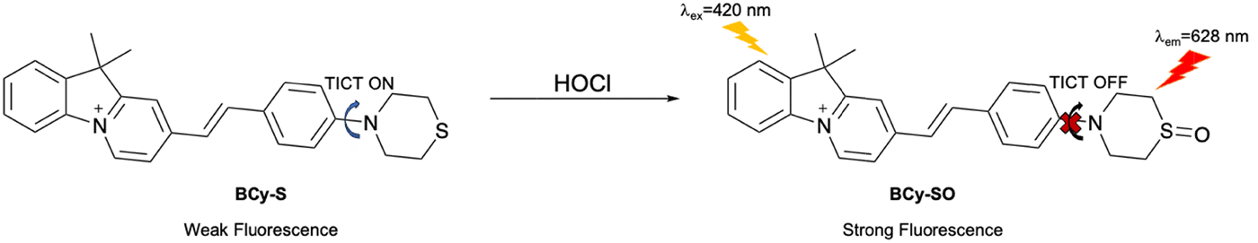 Shao et al. used a benzohemicyanine fluorophore with a thiomorpholine receptor to construct an activity-based fluorescent probe (BCy-S) for HClO detection (Fig. 25). The thiomorpholine group of the probe exhibited TICT upon excitation, leading to the weak fluorescence of BCy-S. Upon the addition of HClO, oxidiation at sulfur resulted in the generation of the sulfoxide. This introduction of an electron-withdrawing motif to the amino auxochrome suppressed the TICT process, leading to a strong red fluorescence emission at 628 nm upon excitation at 420 nm. BCy-S exhibited pH independence, a large Stokes shift, high sensitivity (35.2 nM limit of detection) and excellent selectivity. In addition, BCy-S was used to visualize HClO in living HeLa cells and zebrafish, supporting the photostability and biocompatibility of the probe.105
