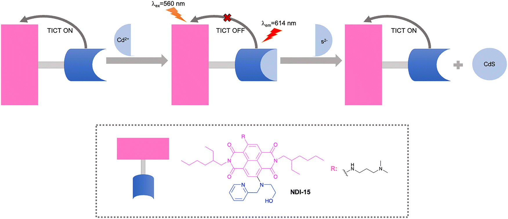 Zong et al. developed a reversible fluorescent probe (NDI-15) with a naphthalenediimide fluorophore as electron acceptor and a 2-((pyridine-2-ylmethyl)amino)ethanol receptor as electron donor for detecting S2− (Fig. 26). The perpendicular orientation of the fluorophore and the receptor in the excited state promoted the TICT process, which led to no fluorescence emission of NDI-15. Cd2+ can coordinate with the probe to form NDI-15-Cd2+, which effectively inhibited the TICT effect and recovered the strong fluorescence emission. Upon the addition of S2−, Cd2+ can be removed by S2− from the 2-((pyridine-2-ylmethyl)amino)ethanol moiety of NDI-15-Cd2+ in order to release NDI-15, through the formation of the sparingly soluble CdS. This in turn results in a fluorescence decrease due to the recovery of the TICT process. Based on this displacement mechanism, NDI-15 exhibited excellent sensitivity with a detection limit of 8.7 µM for the detection of S2−.110