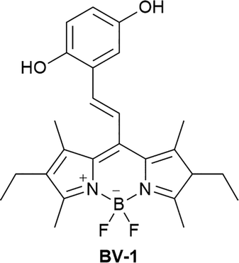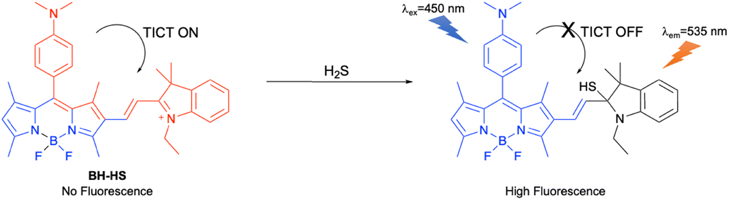 Ren et al. developed a turn-on activity-based fluorescent probe (BH-HS) consisting of a BODIPY fluorophore and a hemicyanine receptor for H2S detection (Fig. 27). In the excited state, the TICT process from the dimethylaniline group to the hemicyanine moiety occurred, which quenched the fluorescence of BH-HS. The addition of (highly nucleophilic) H2S resulted in nucleophilic addition to the iminium group of the hemicyanine, giving a product in which the TICT process was inhibited, resulting in a strong fluorescence response. BH-HS exhibited high selectivity towards H2S and excellent sensitivity with a detection limit of 1.7 µM which is below the physiological H2S concentration in the serum and the brain of mammals. BH-HS was also used to image the levels of exogenous and endogenous H2S in living HeLa cells.111