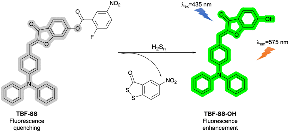 Meng et al. designed an activity-based fluorescent probe (TBF-SS) consisting of a triphenylamine-benzofuran fluorophore and a nitrofluorobenzoate receptor (Fig. 28) for H2Sn detection. (Note that such polysulfides also exist predominantly as anions at physiological pH). The fluorophore was linked with the receptor motif by an ester linkage. The non-coplanarity of the benzofuran unit and the nitrofluorobenzene group and the charge transfer from the triphenylamine group to the benzofuran unit resulted in the TICT effect, based on rotation around both ester C–O single bonds. This TICT process effectively quenched the fluorescence of TBF-SS. The addition of H2Sn resulted in an SNAr reaction with the nitrofluorobenzoate ring, leading to elimination of fluoride and formation of an aryl polysulfide. In the second reaction step, the other terminal sulfur atom attacks the ester carbonyl, leading to loss of an acylpolysulfide fragment, cleavage of the ester and formation of TBF-SS-OH. As the TICT process is no longer operative in TBF-SS-OH, a “turn-on” fluorescence response is observed. TBF-SS exhibited high selectivity towards H2Sn, over other RSS such as H2S. This selectivity is due to the mechanism of action of the probe, since the formation of the acylpolysulfide byproduct in step 2 is viable for H2Sn where n = 2 (giving the byproduct shown in Fig. 28), n = 3 or n = 4, but not for n = 1. Hence, whilst H2S can participate in the initial SNAr step, the second step (required for the fluorescence response) does not occur. TBF-SS has excellent sensitivity with a detection limit of 10 nM and was used to monitor the H2Sn levels in tea samples and to image exogenous H2Sn in living MCF-7 cells.112,113