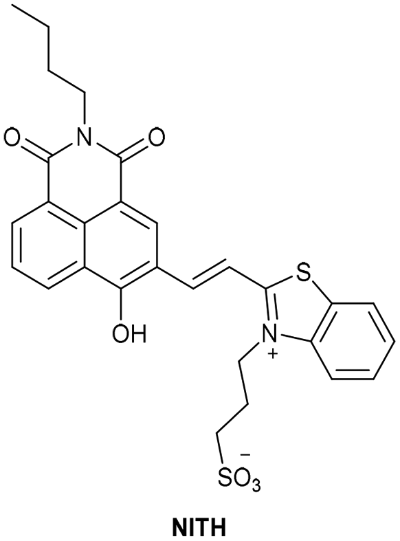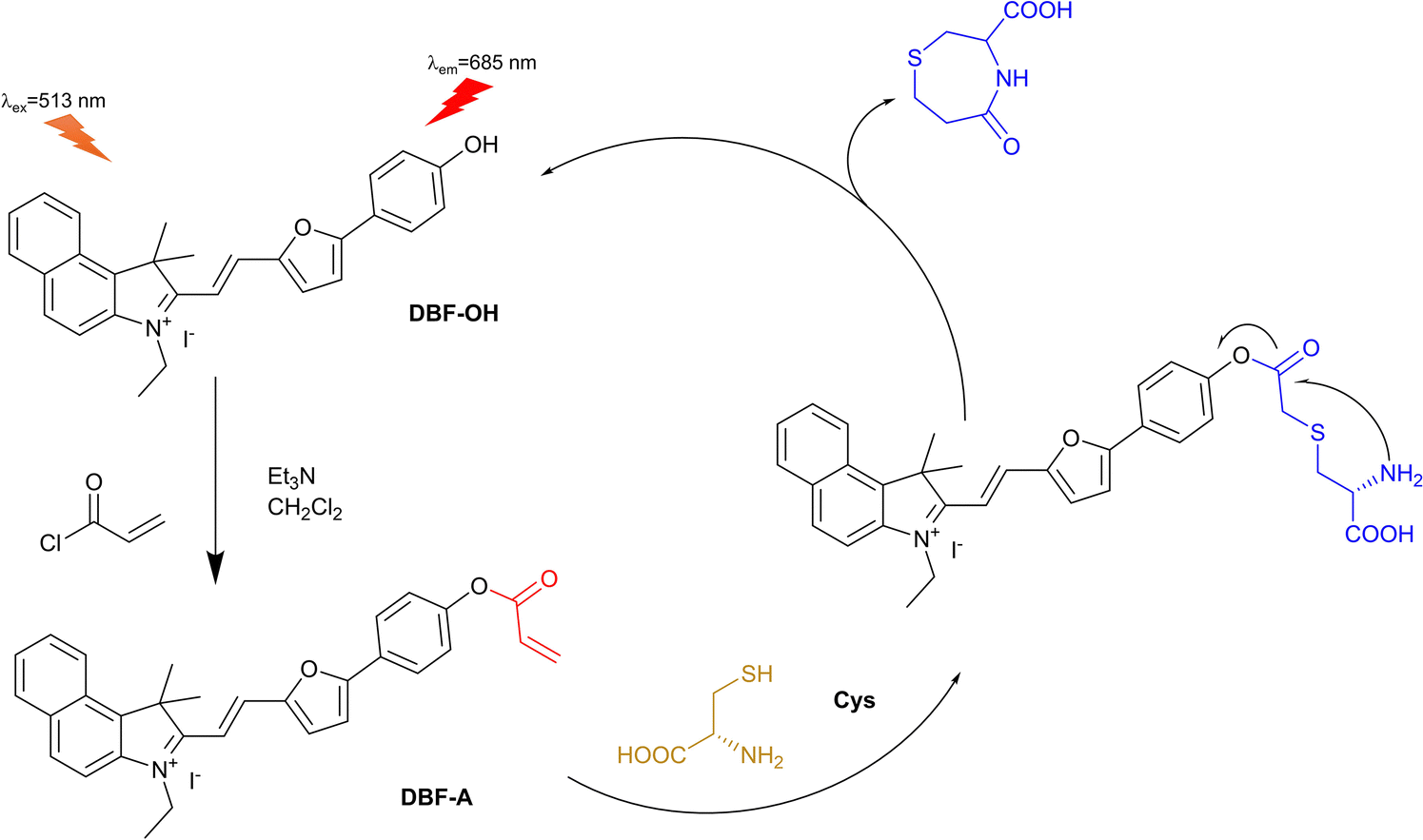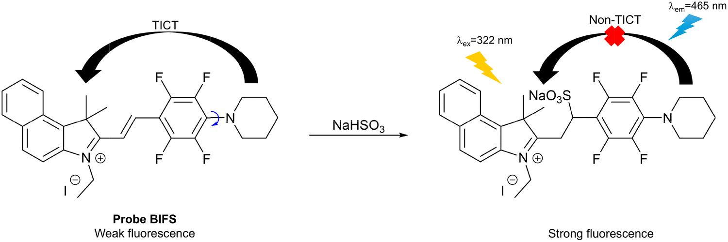 Zhu et al. developed a 1H-Benzo[e]indolium-based fluorescent probe (BIFS) for HSO3− detection (Fig. 29). In the excited state, an electron is transferred from the piperidinyl donor to the 1H-Benzo[e]indolium acceptor. At the same time, twisting of the piperidinyl moiety disrupts the co-planarity. The on state of the TICT process results in BIFS exhibiting weak fluorescence. However, the addition of HSO3− promoted its nucleophilic addition to the α,β-unsaturated iminium group and switched off the TICT process to achieve a strong fluorescence emission at 465 nm when excited at 322 nm. The detection limit of BIFS towards HSO3− was 3.0 nM, illustrating the excellent sensitivity of the probe. In addition, BIFS exhibited good cell permeability when used to image HSO3− in living A549 cells.117